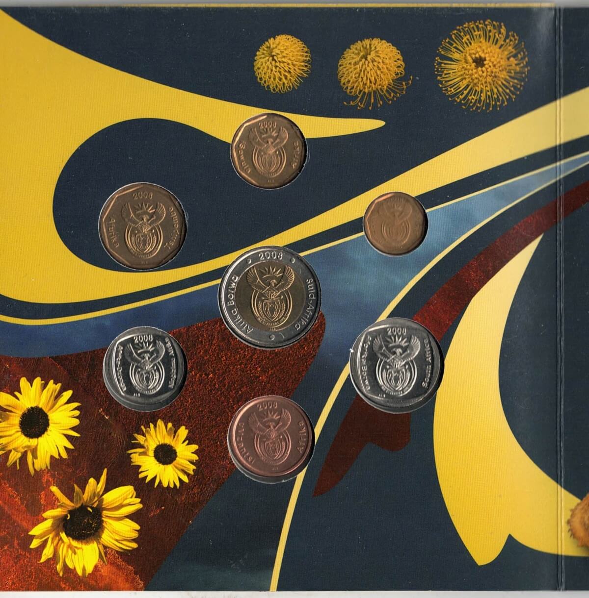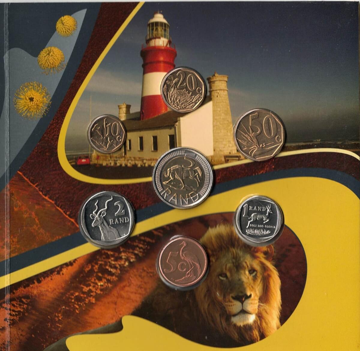 The coins in this set consists of a five rand, two rand, one rand, fifty cent, twenty cent, ten cent and five cent.