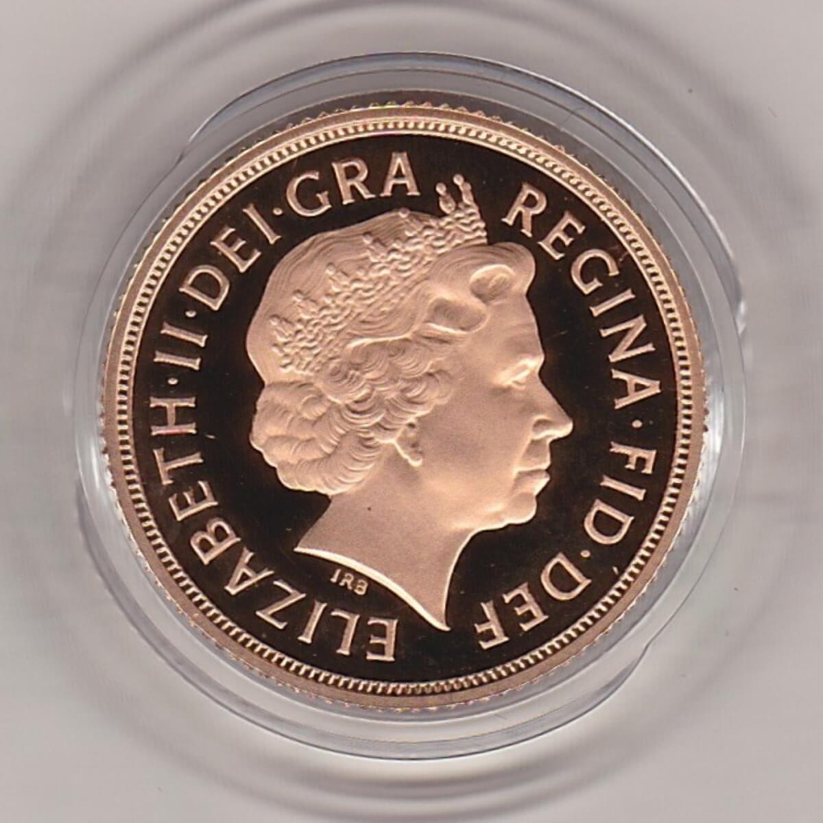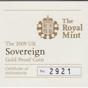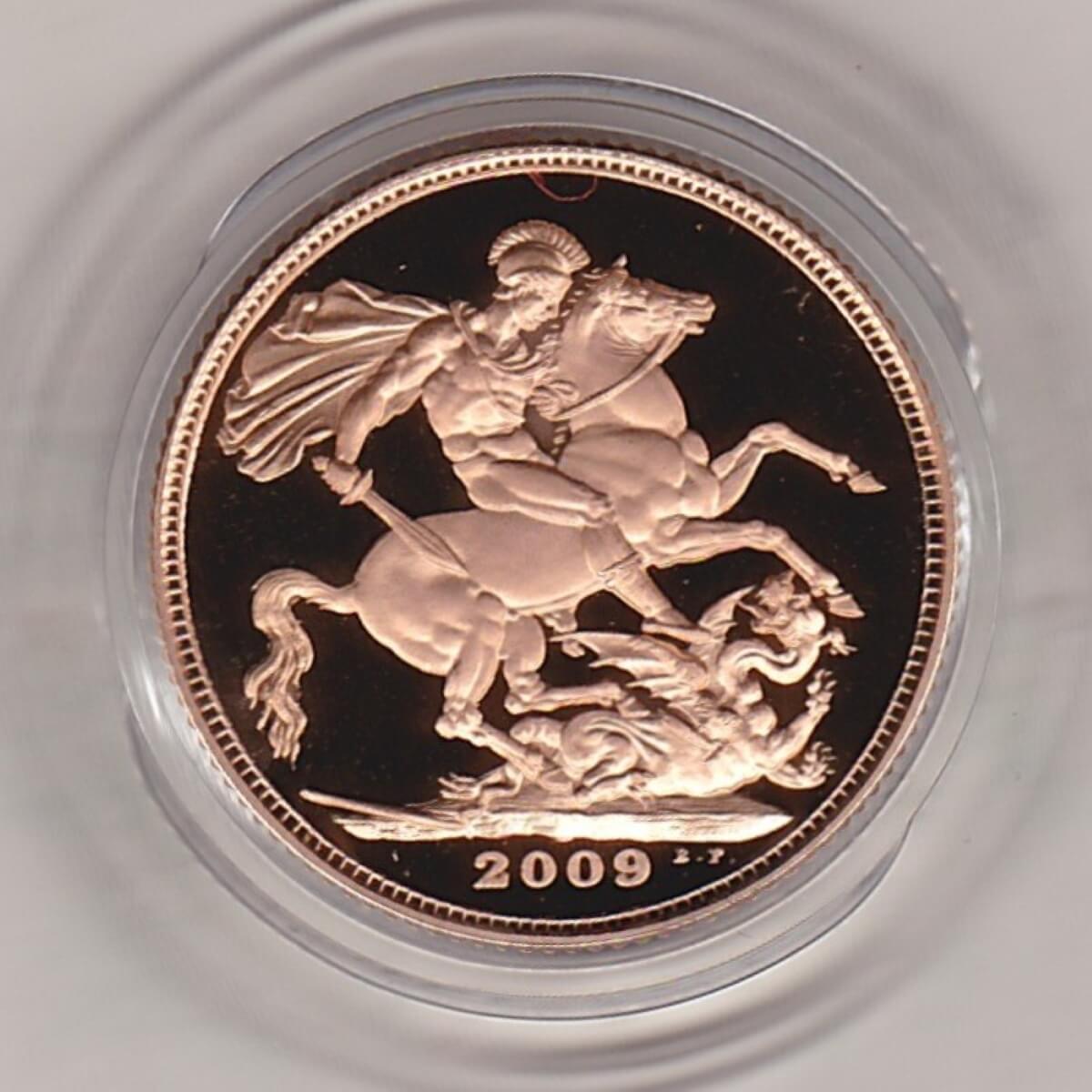The 2009 proof sovereign is a coin struck in 22 carat gold by the Royal Mint. The obverse was the fourth definitive UK coin portrait by Rank-Broadley, and was intended to be more realistic than previous portraits. Rank-Broadley said he wanted to “maximize its impact on smaller coins” by making the portrait as large as possible. A crowned portrait of HM Queen Elizabeth II facing right, wearing the Girls of Great Britain and Ireland tiara, legend around complete the design. On the reverse side of this coin you can see Benedetto Pistrucci’s depiction of Saint George slaying a dragon. The coin’s date is also inscribed at the bottom of the reverse.