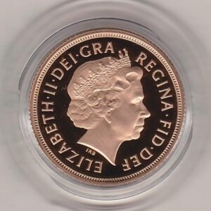 The 2009 proof sovereign is a coin struck in 22 carat gold by the Royal Mint. The obverse was the fourth definitive UK coin portrait by Rank-Broadley, and was intended to be more realistic than previous portraits. Rank-Broadley said he wanted to “maximize its impact on smaller coins” by making the portrait as large as possible. A crowned portrait of HM Queen Elizabeth II facing right, wearing the Girls of Great Britain and Ireland tiara, legend around complete the design. On the reverse side of this coin you can see Benedetto Pistrucci’s depiction of Saint George slaying a dragon. The coin’s date is also inscribed at the bottom of the reverse.