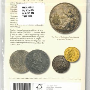 The Obverse features the fourth crowned portrait of HM Queen Elizabeth II facing right. The Reverse features St. Edward’s crown above spray of oak leaves and interlinked C’s representing the coinage of King Charles II.