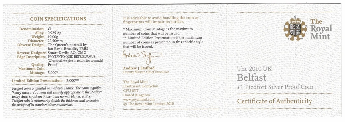 2010 One Pound Piedfort Silver Proof ‘Belfast’ Coin In Near Mint Condition.