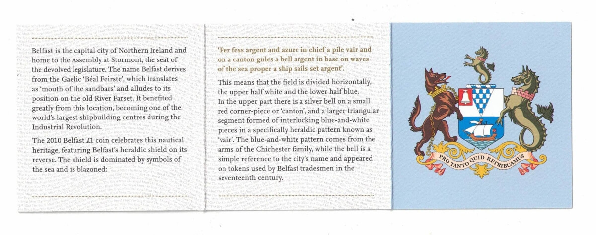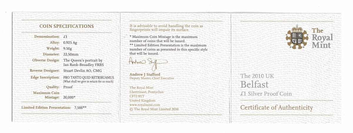 2010 One Pound Silver Proof ‘Belfast’ Coin In Near Mint Condition.