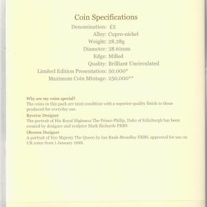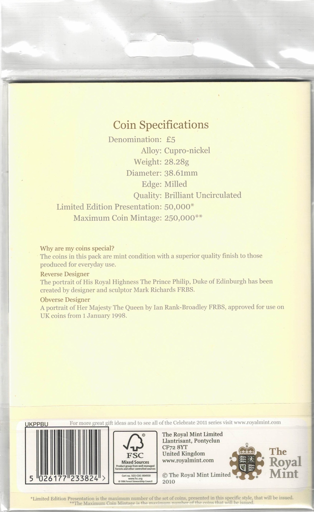 2011 Five Pound Commemorative Coin His Royal Highness The Prince Philip, Duke of Edinburgh, marking his 90th Birthday Celebration.