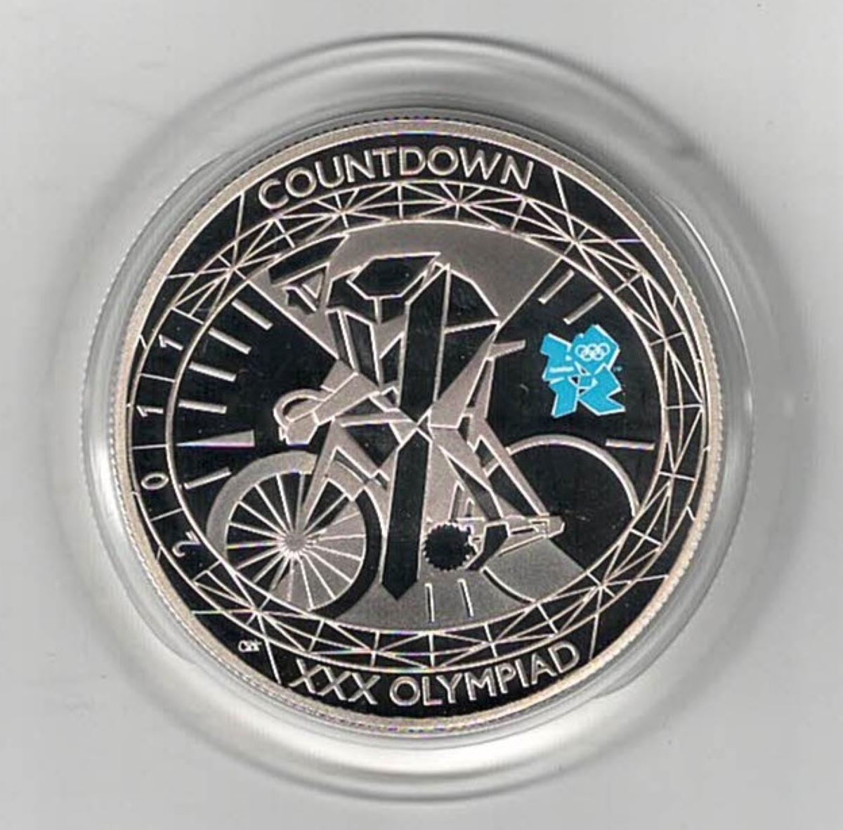 The Obverse features the crowned portrait of Queen Elizabeth II facing right. The reverse features a central stylised design of a cyclist mingled with large digital 1 number (to signify 2011 is one year to 2012 Olympics).
