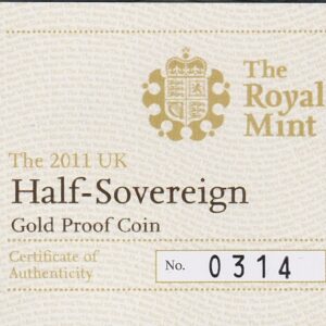 The 2011 half sovereign is a coin struck in 22 carat gold as a proof by the Royal Mint. The Obverse features the fourth crowned portrait of Queen Elizabeth II facing right, wearing the Girls of Great Britain and Ireland tiara, with legend around. The Reverse features St. George slaying the dragon right, with date and designer’s initials in exergue.