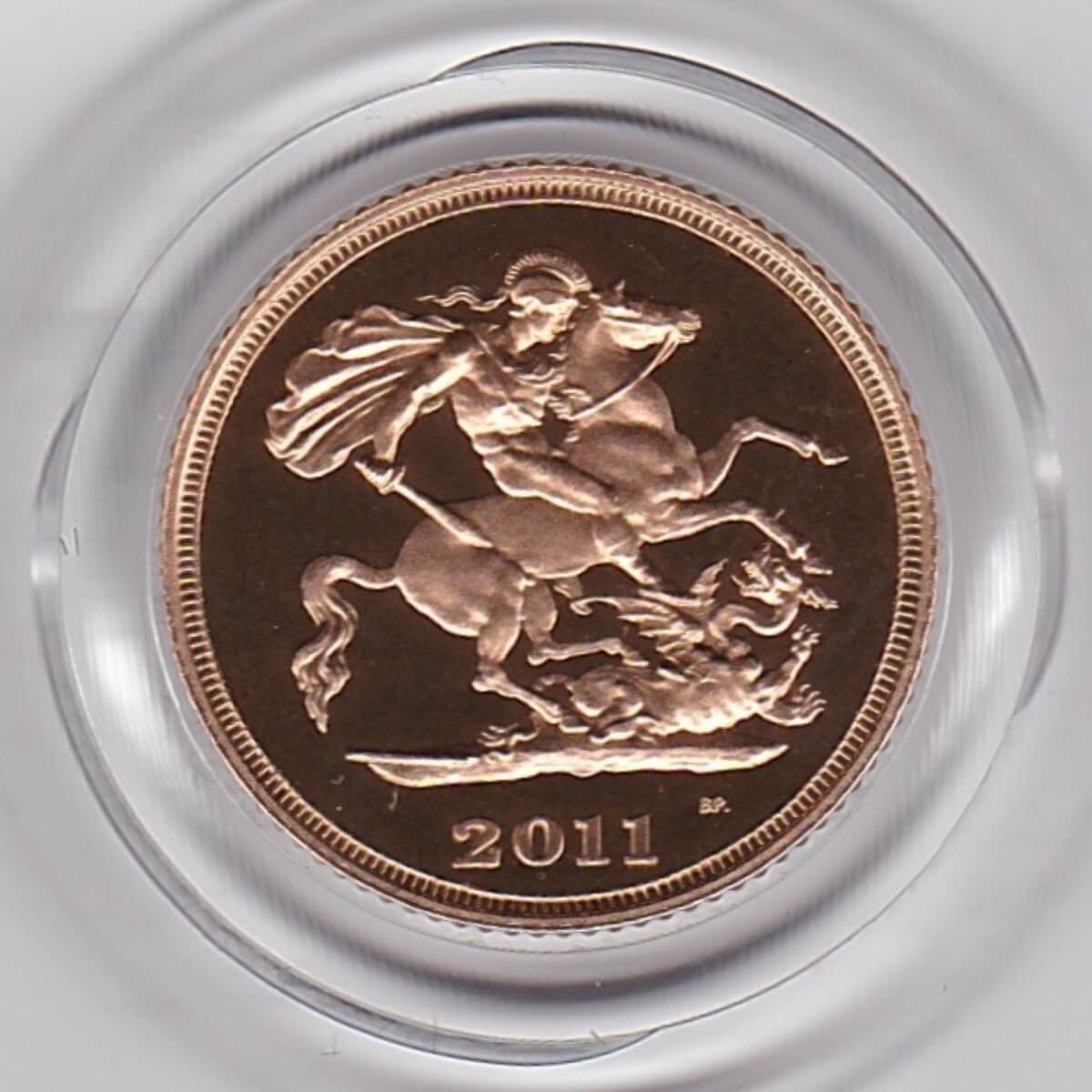 2011 gold proof half sovereign coin in capsule. This coin features Queen Elizabeth II on the obverse and St George and the dragon on the Reverse.2011 Gold Proof Half Sovereign