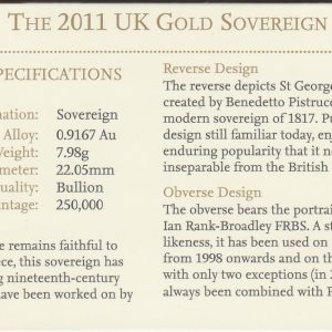 The 2011 sovereign is a coin struck in 22 carat gold by the Royal Mint. The obverse of this coin features the fourth crowned portrait of HM Queen Elizabeth II facing right. The Queen is wearing the Girls of Great Britain and Ireland tiara, with legend around. The reverse depicts St. George slaying the dragon, with the date and designer’s initials in exergue.