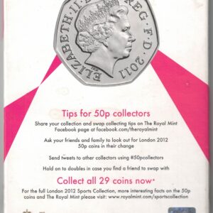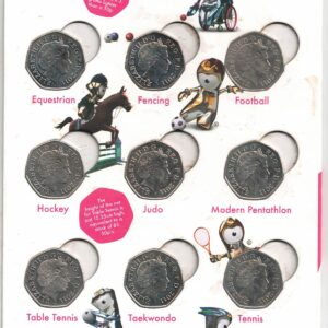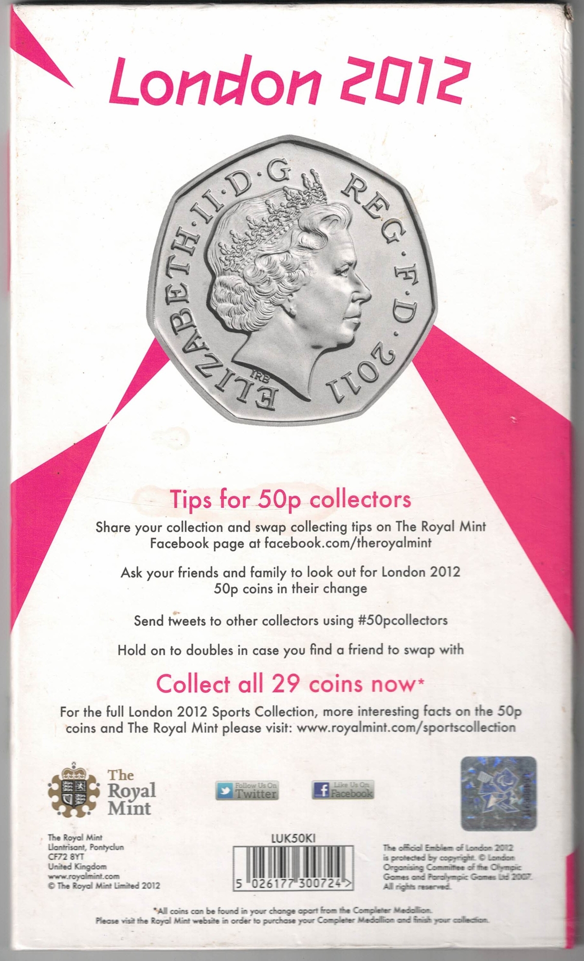Each Cupro-Nickel Fifty Pence coin comes displayed in a Card London 2012 Collection Album. The ‘Completer Medal’ is missing.