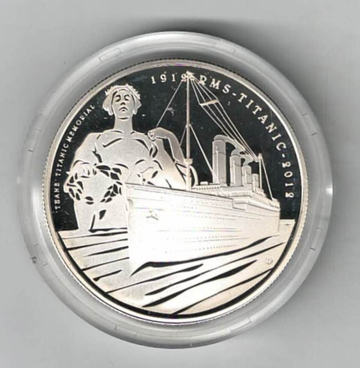 The Obverse features the crowned portrait of Queen Elizabeth II facing right. The reverse features the titanic ship with titanic memorial statue.