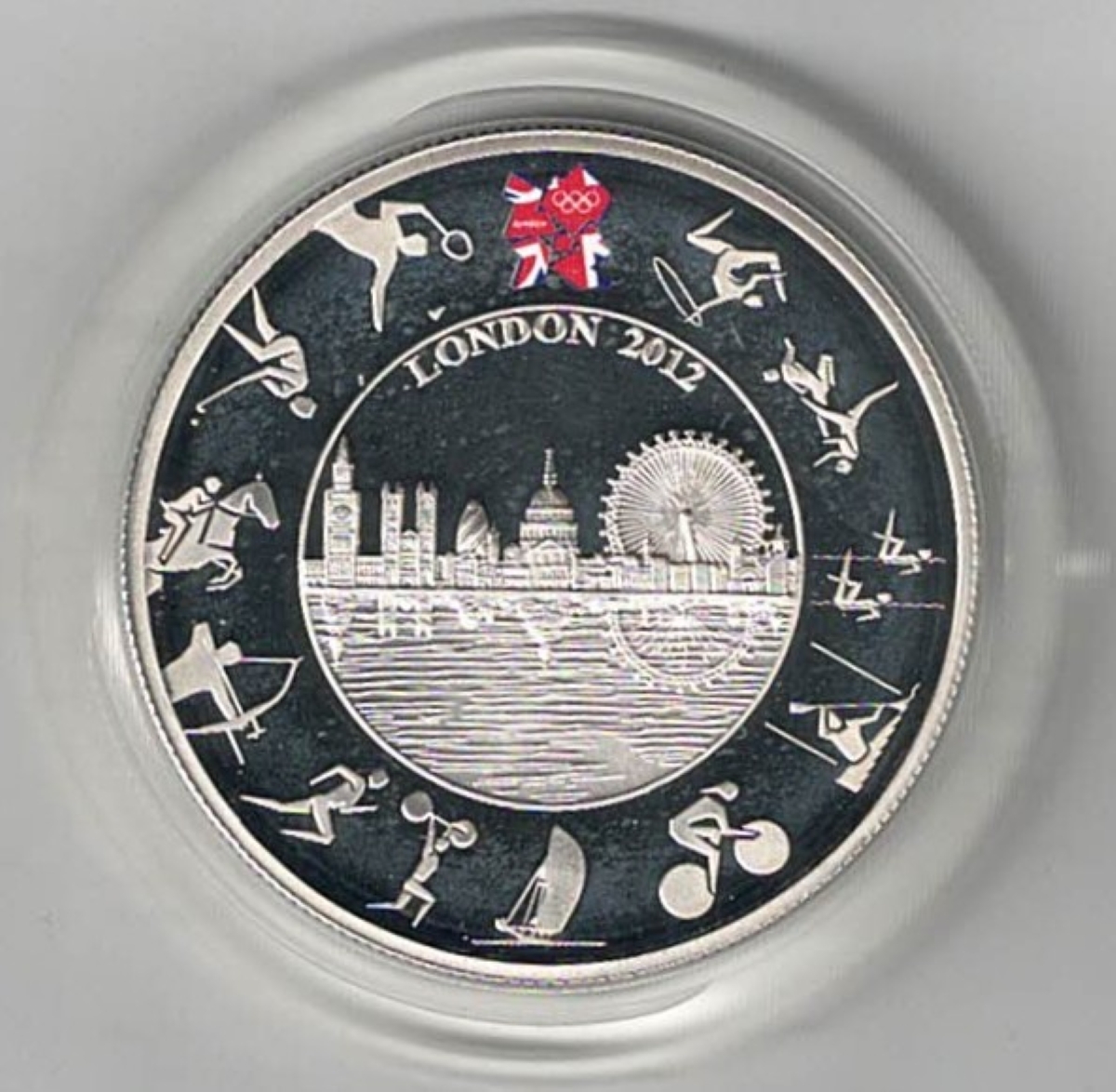 The Obverse features the crowned portrait of Queen Elizabeth II facing right. The reverse features the London skyline and the River Thames, with the pictograms of athletes placed around the outside of the design like a clock face, representing one of London’s greatest icons – Big Ben. The official London 2012 Olympic emblem appears in colour at the top of the design.