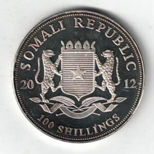 2012 Silver Somali Republic One Ounce Elephant 100 Shillings Coin in near mint condition.