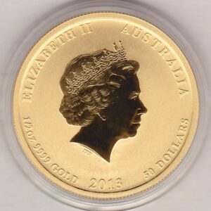 This 2013 half ounce coin was struck by the Perth Mint in Australia. The obverse features the portrait of Queen Elizabeth. The reverse features a coiled Snake and Chinese character for Snake to the left. This coin was issued as part of the Lunar series II.