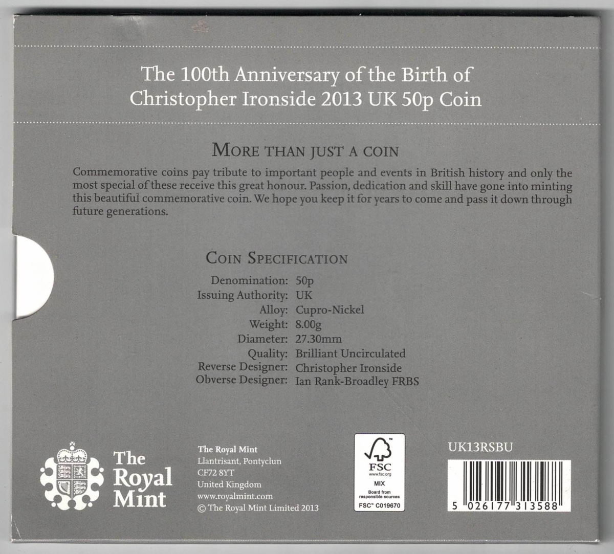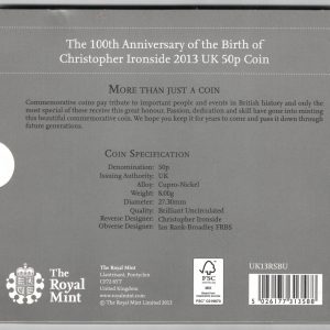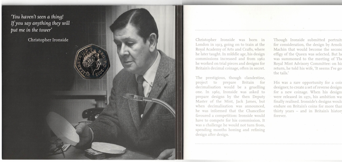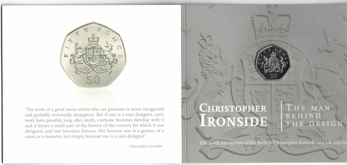 2013 Fifty Pence coin Christopher Ironside, The man behind the design In Mint Condition.