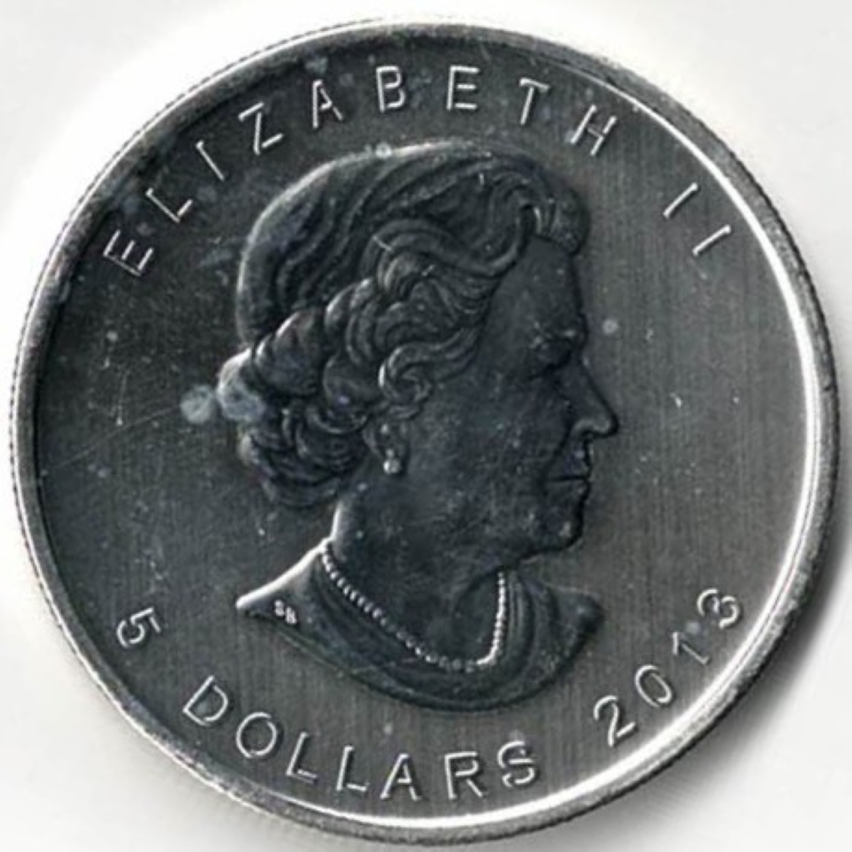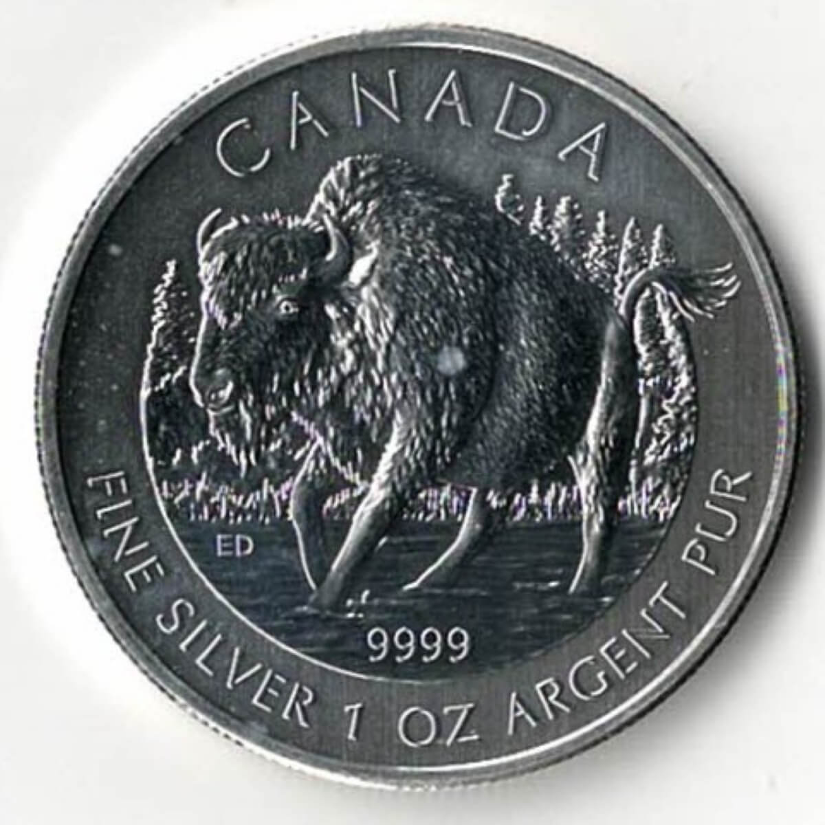 The 2013 Bison is a coin struck in fine silver by the Canadian Mint . The obverse features Elizabeth II facing Right. The reverse depicts a Wood Bison galloping through the snow.