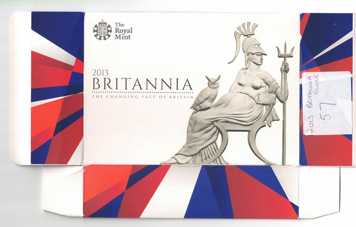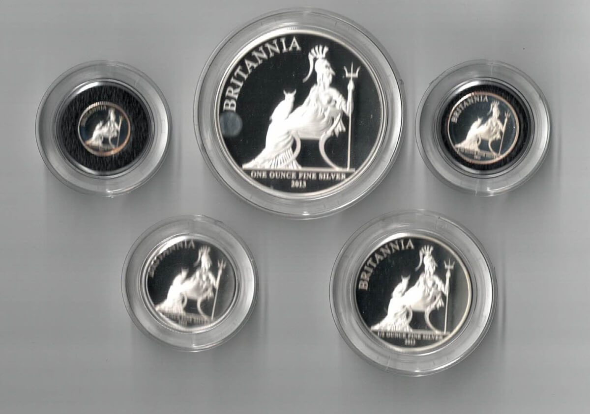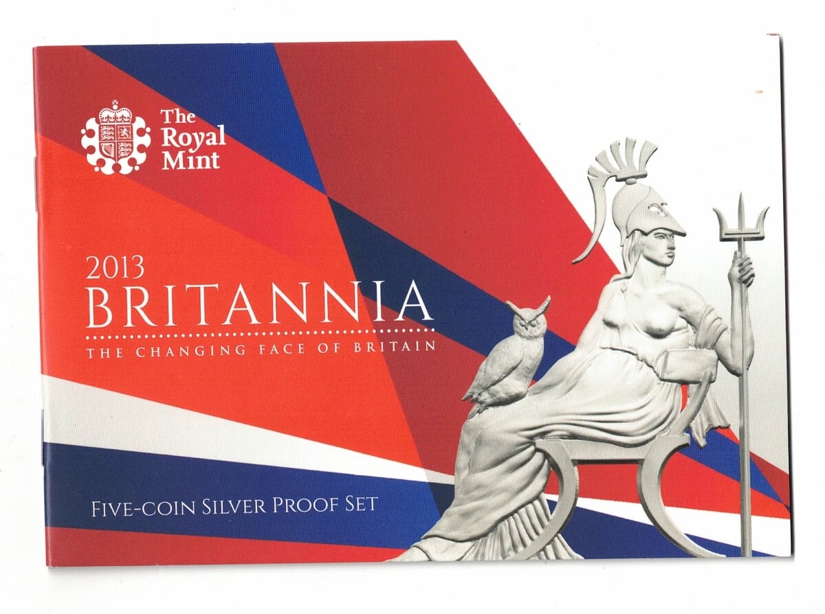 The 2013 Britannia proof set was struck in 999 silver by the Royal Mint. The obverse on each coin features the portrait of Queen Elizabeth II facing right. The reverse depicts Britannia facing forward, with owl, shield and trident.