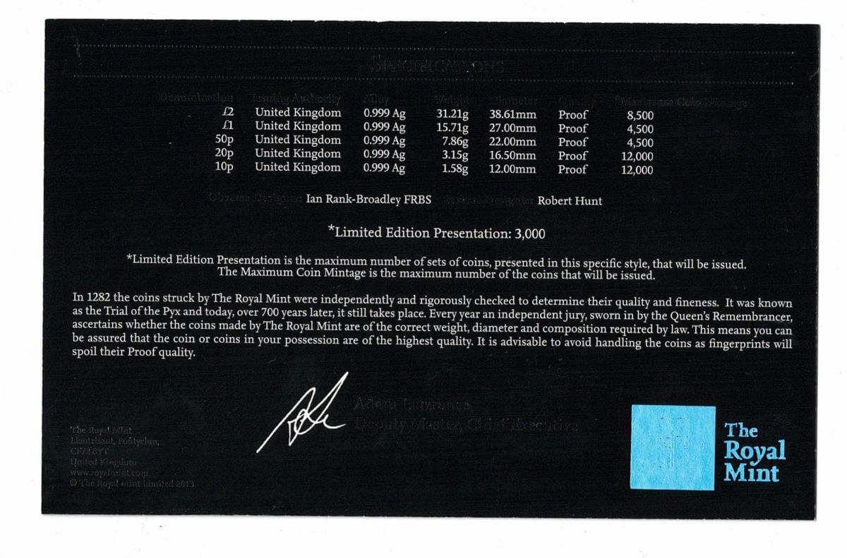 These five coins come in the original black presentation box with certificate & booklet as issued by the Royal Mint. There is a cardboard decorative sleeve to protect the box. Please note the sleeve has a handwritten sticker on the side, as seen if the photos.