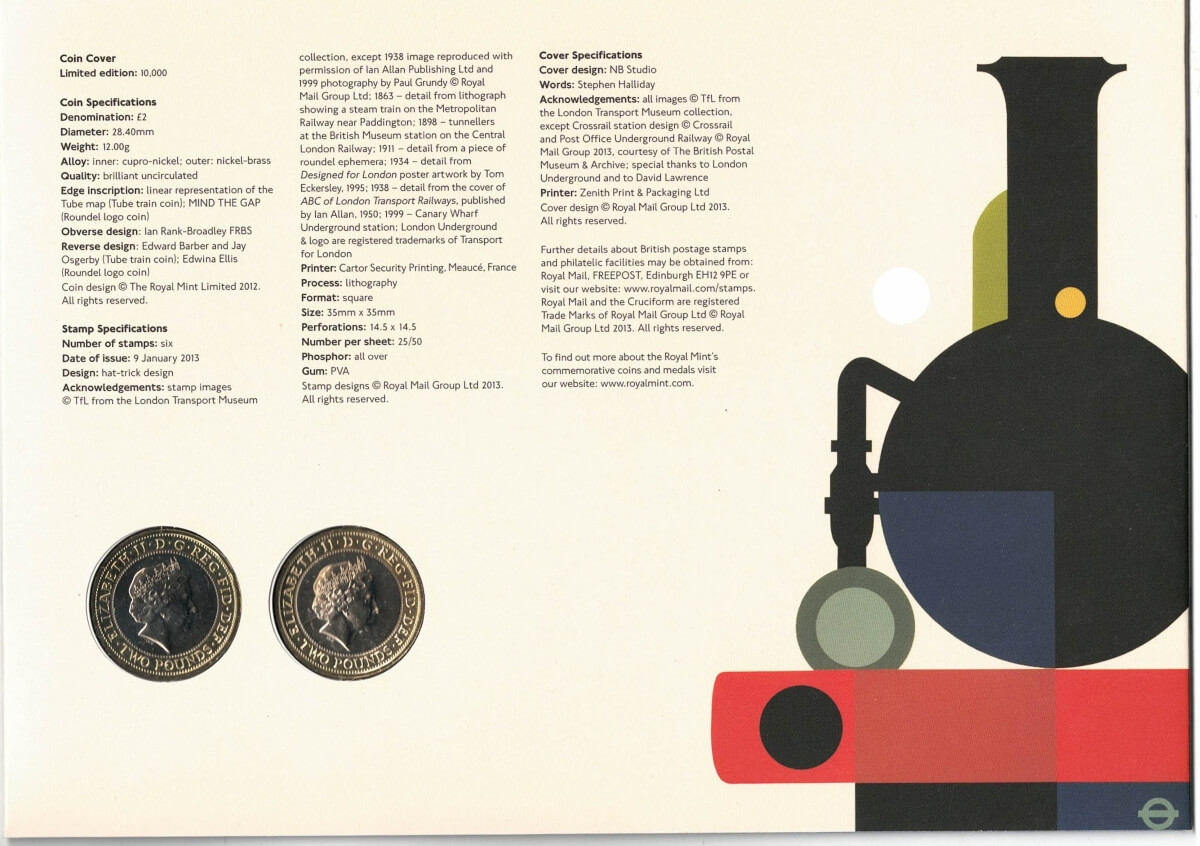 2013 Royal Mint Brilliant Uncirculated Two Pound Coins The London Underground Stamp Cover Set In Mint Condition.