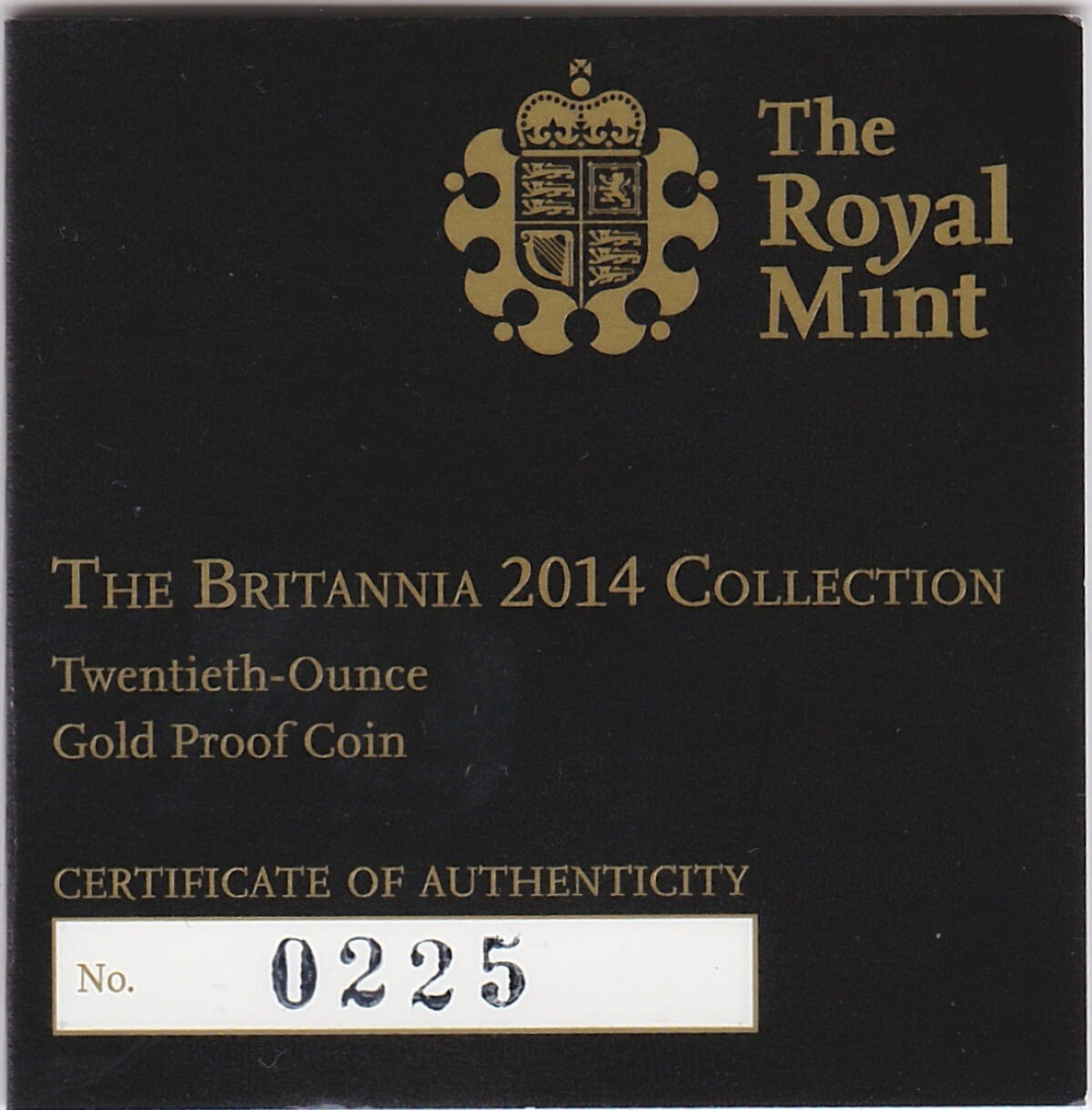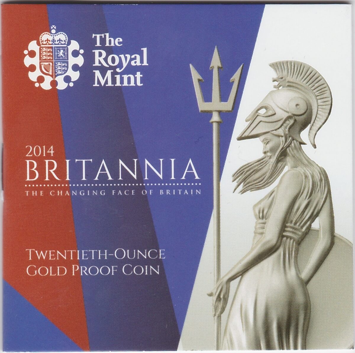 The 2014 gold twentieth ounce Britannia was minted by the Royal Mint. The obverse features the portrait of HM Queen Elizabeth II facing to the right, with legend around. The reverse features the standing figure of Britannia, with globe background, lion at feet, and legend around.