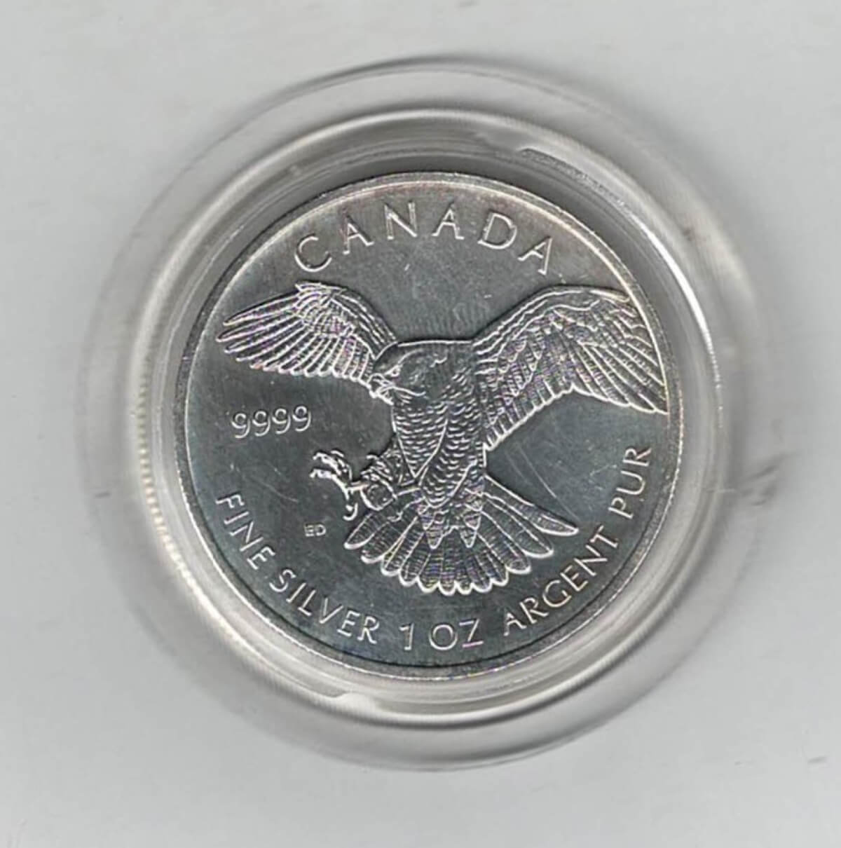 The 2014 Bird of prey is a coin struck in fine silver by the Canadian Mint . The obverse features Elizabeth II facing Right. The reverse features a Peregrin Falcon facing left.