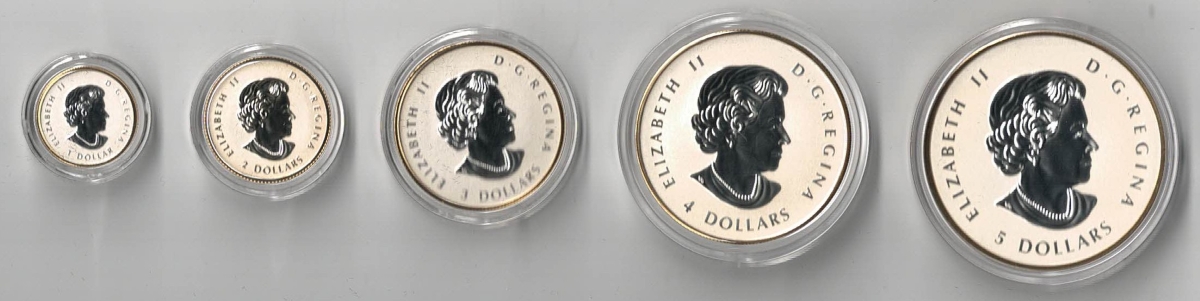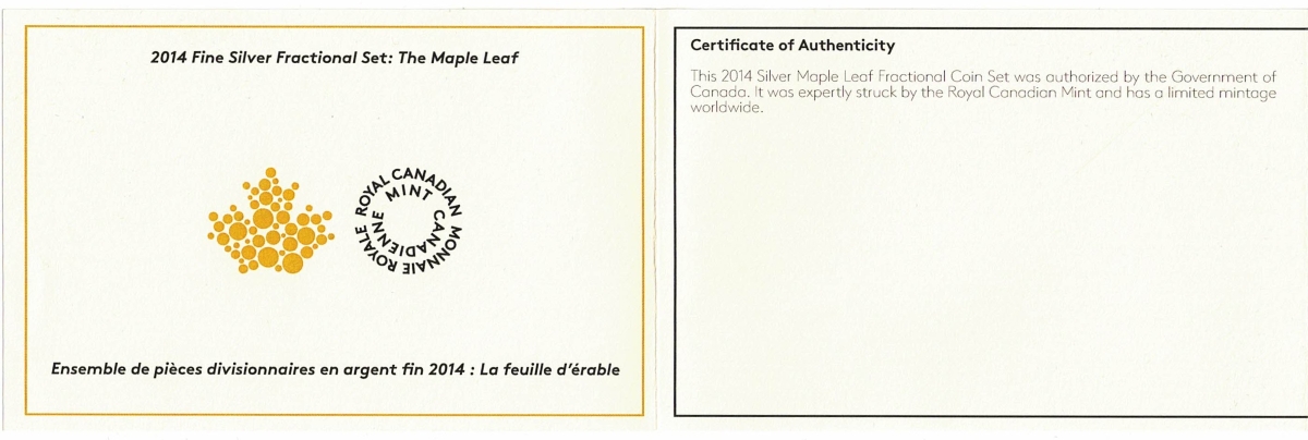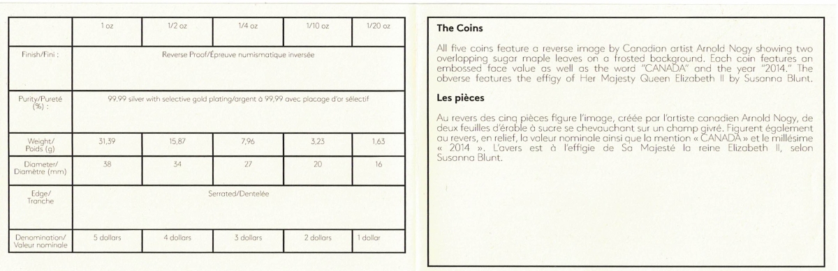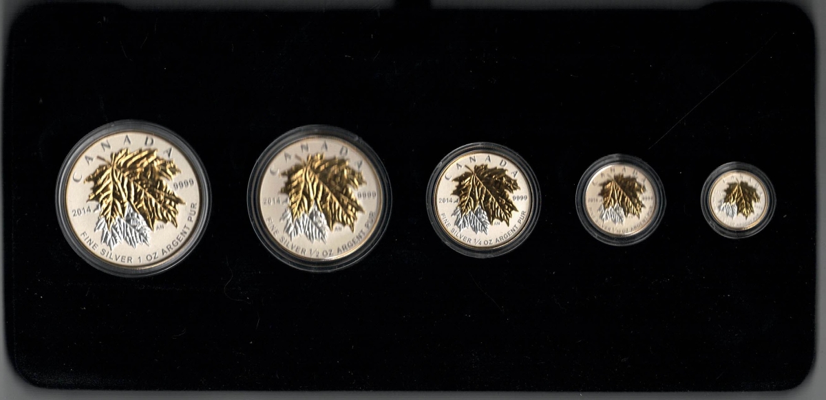 The 2014 Canadian Maple five coin set was struck in 9999 silver by the Royal Canadian Mint of Ottawa.