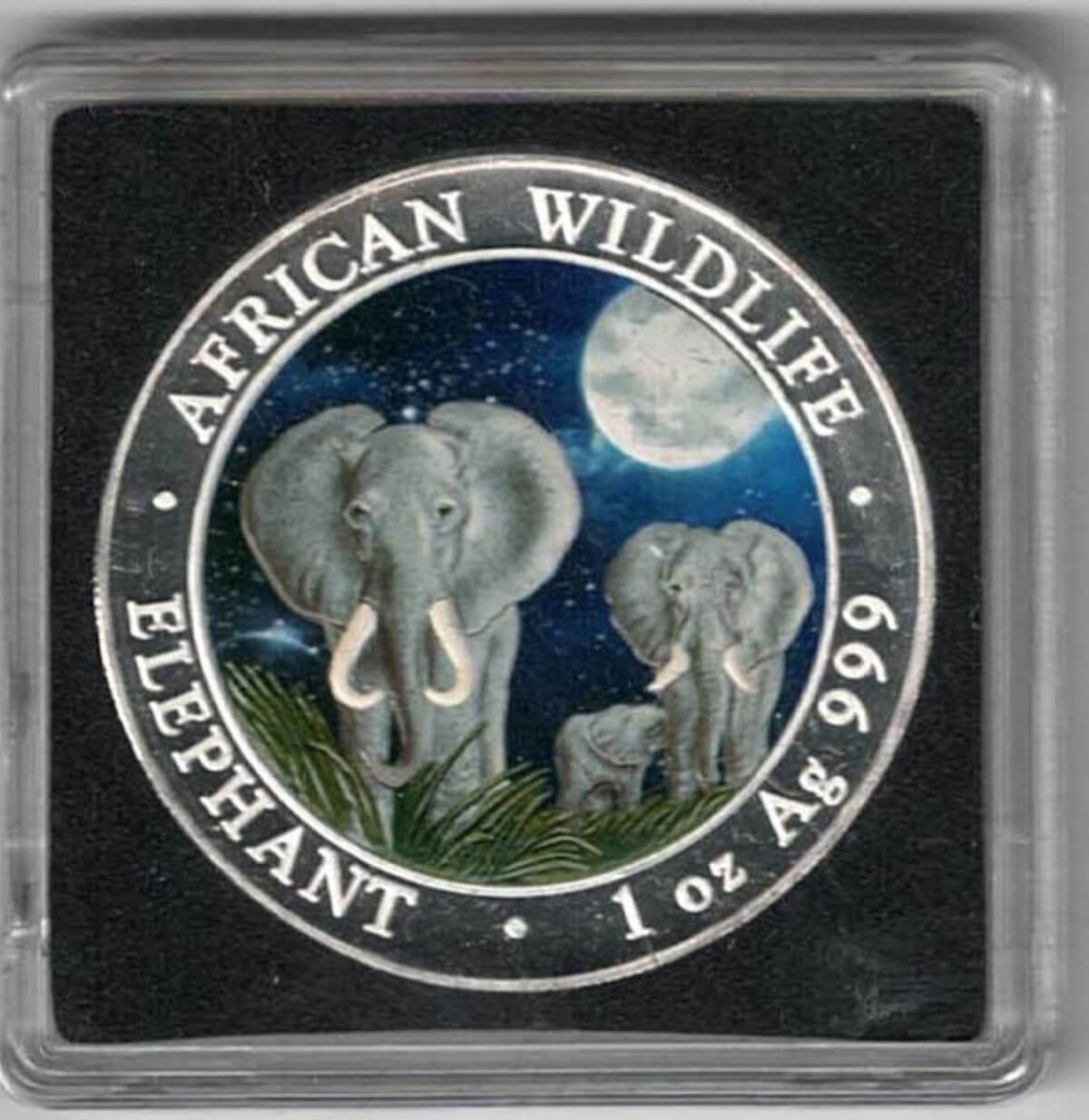 2014 Silver Somali Republic One Ounce Elephant Colourised Night Edition. This Coin does feature two Elephants in the grass.2014 Silver Somali Republic One Ounce Elephant Colourised Night Edition