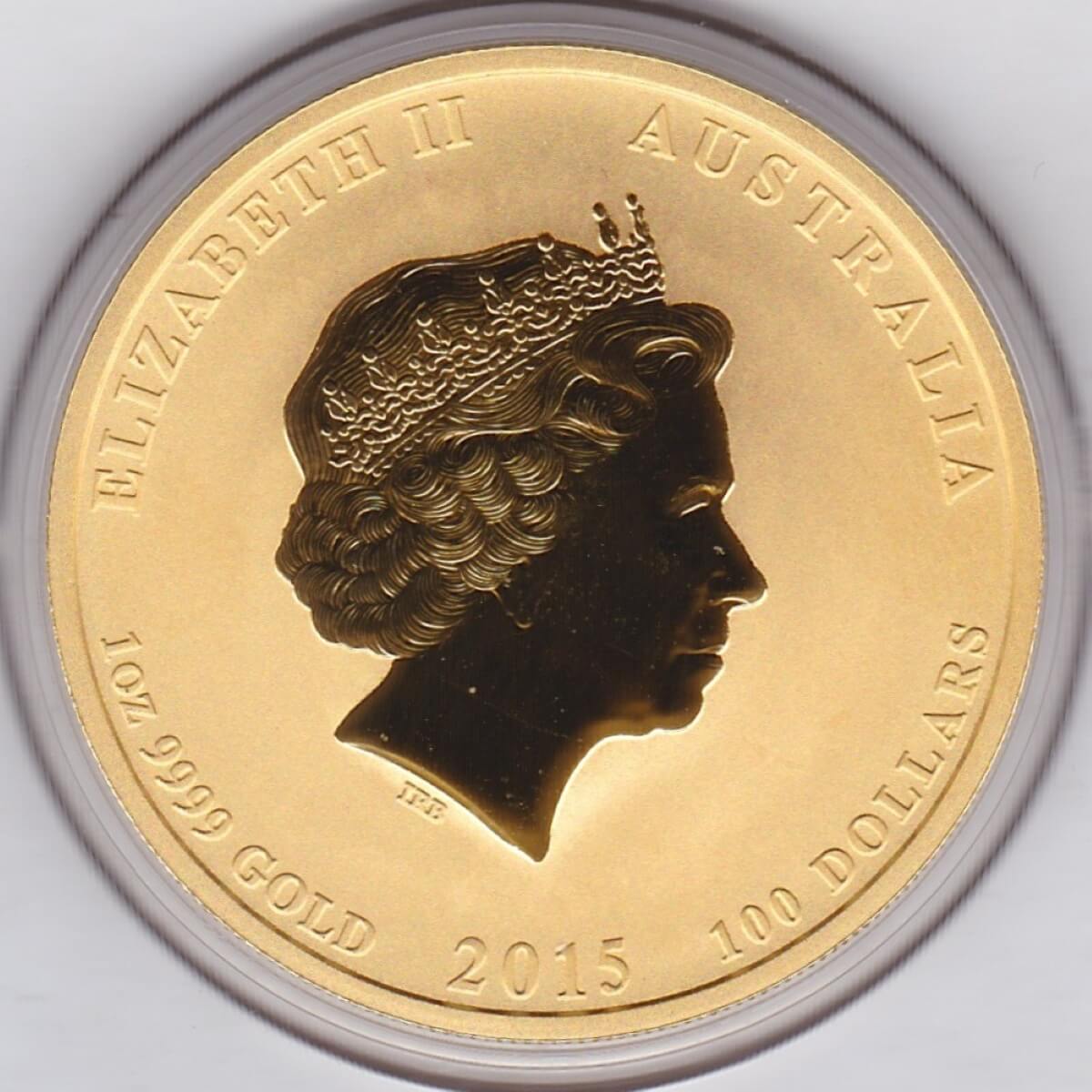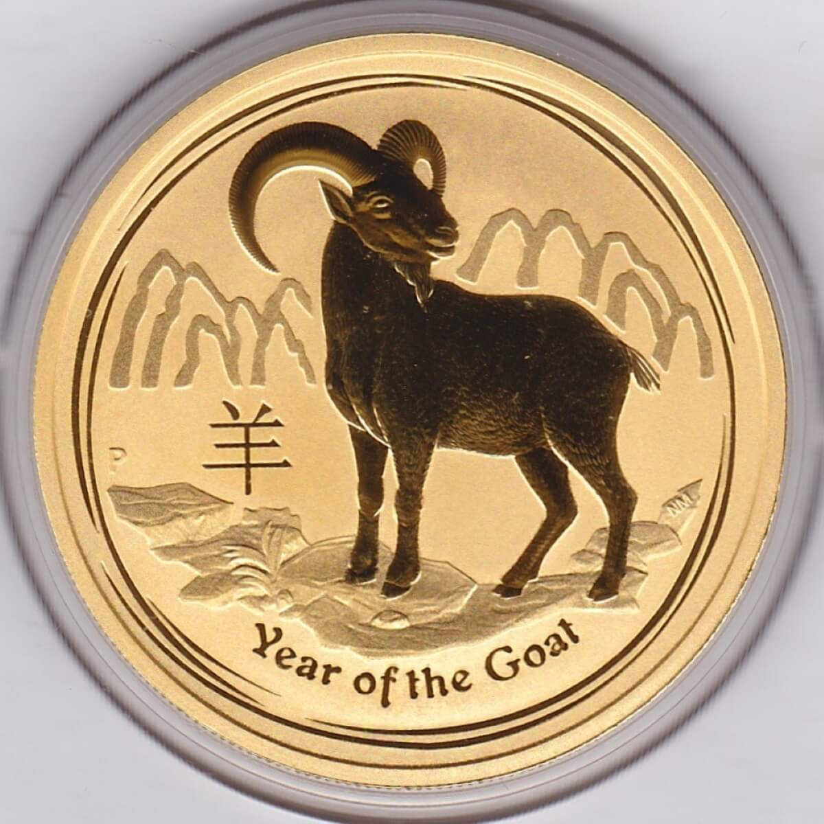 2015 Australia Gold One Ounce Coin. The reverse features a goat and was issued as part of the Lunar series II collection. 2015 Australia Gold One Ounce – Goat