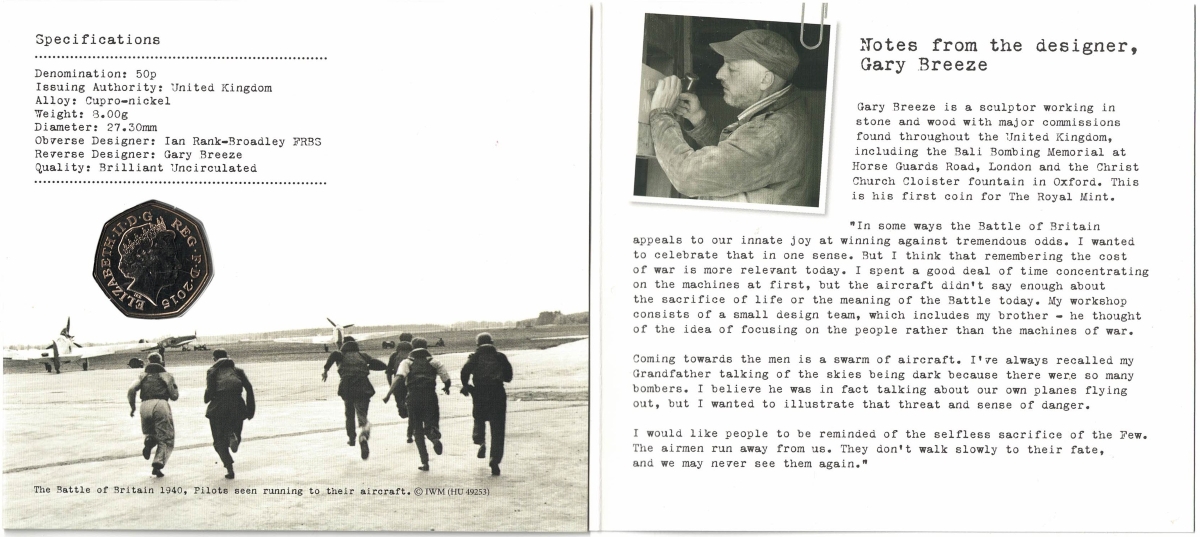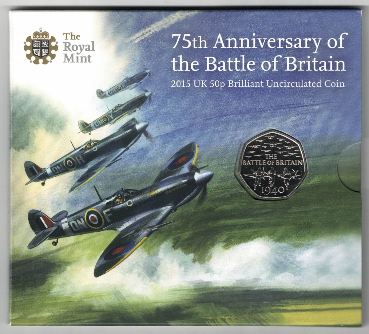 2015 Fifty Pence 75th Anniversary Battle of Britain cupro nickel coin featuring Queen Elizabeth II on the Obverse. All coins are in stock.2015 Fifty Pence 75th Anniversary of the Battle of Britain