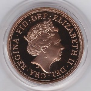 The gold five pounds, five sovereigns or quintuple sovereign was struck in 22 carat gold by the Royal Mint. The Obverse features the fifth crowned portrait of Queen Elizabeth II facing right, wearing the George IV State Diadem, with legend around. The reverse features St George and the dragon, with date below.