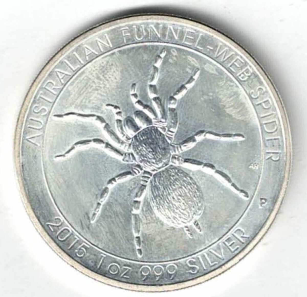 This 2015 coin was struck in fine silver by the Perth Mint . The obverse features Elizabeth II facing Right. The reverse features a Funnel-Web Spider.