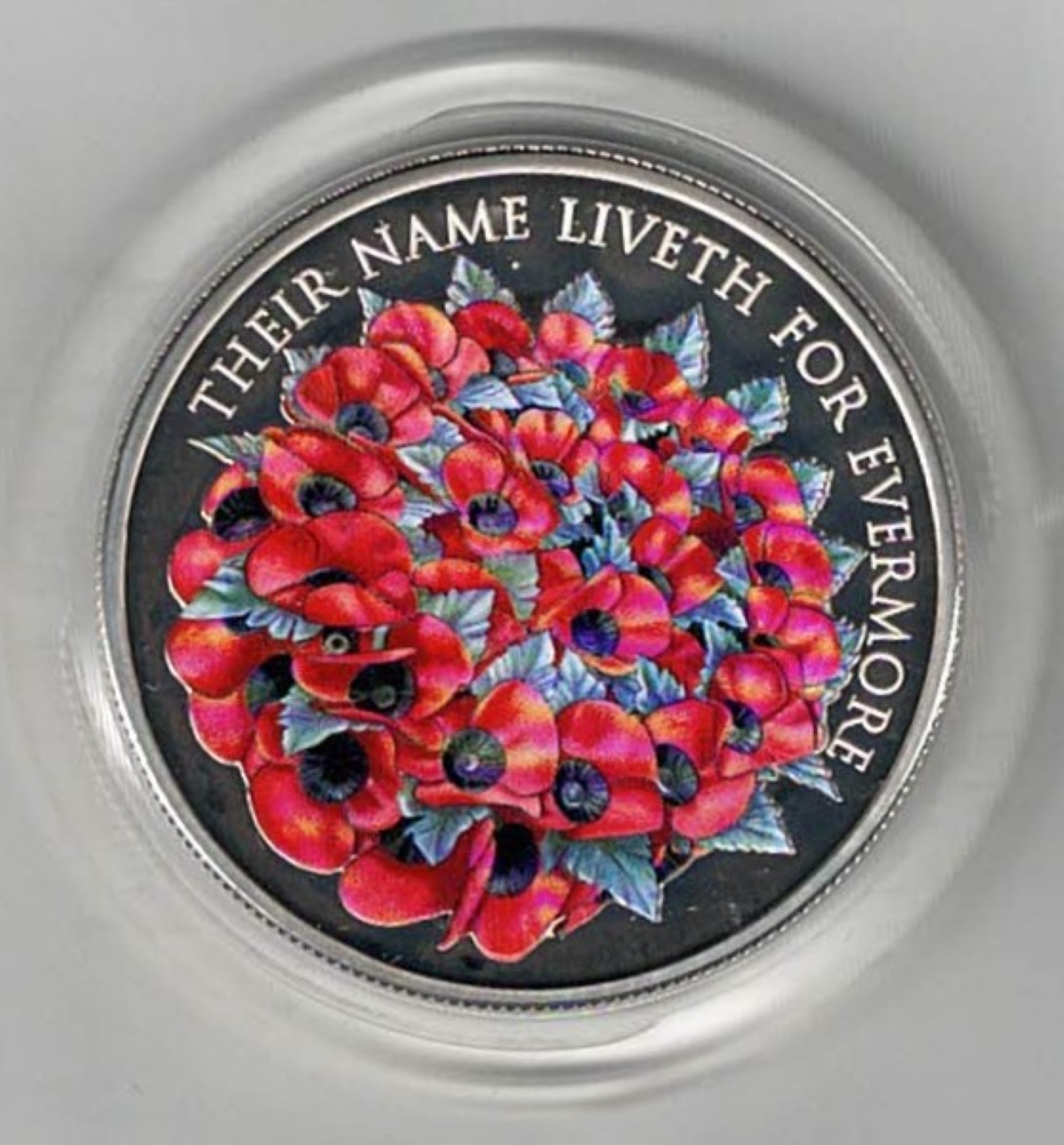 The Obverse features the crowned portrait of Queen Elizabeth II facing right. The reverse features Colour printed poppies with lettering.