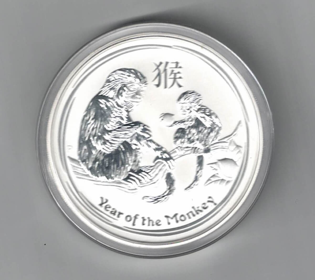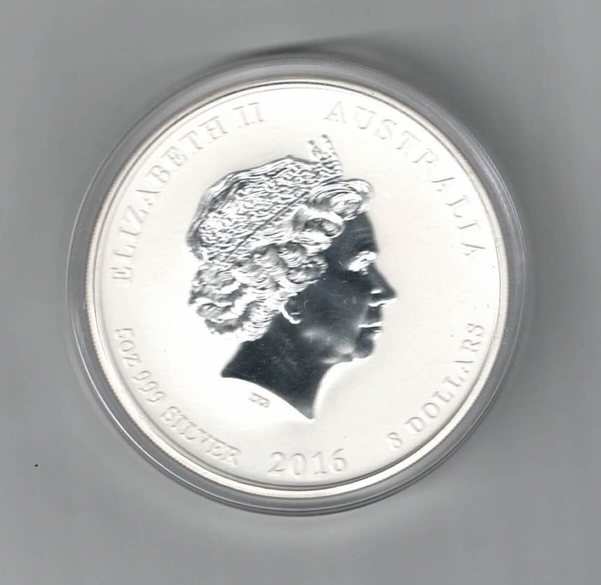 2016 Australia Lunar Year Of The Monkey Silver Five Ounce Coin. The obverse features the portrait of Queen Elizabeth II facing right.2016 Australia Lunar Year Of The Monkey Silver Five Ounce Coin