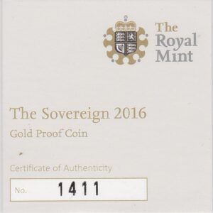 The 2016 proof sovereign is a coin struck in 22 carat gold by the Royal Mint. The obverse features the limited release Butler effigy of Queen Elizabeth II facing right, with legend around. On the reverse side of this coin you can see Benedetto Pistrucci’s depiction of Saint George slaying a dragon. The coin’s date is also inscribed at the bottom of the reverse.