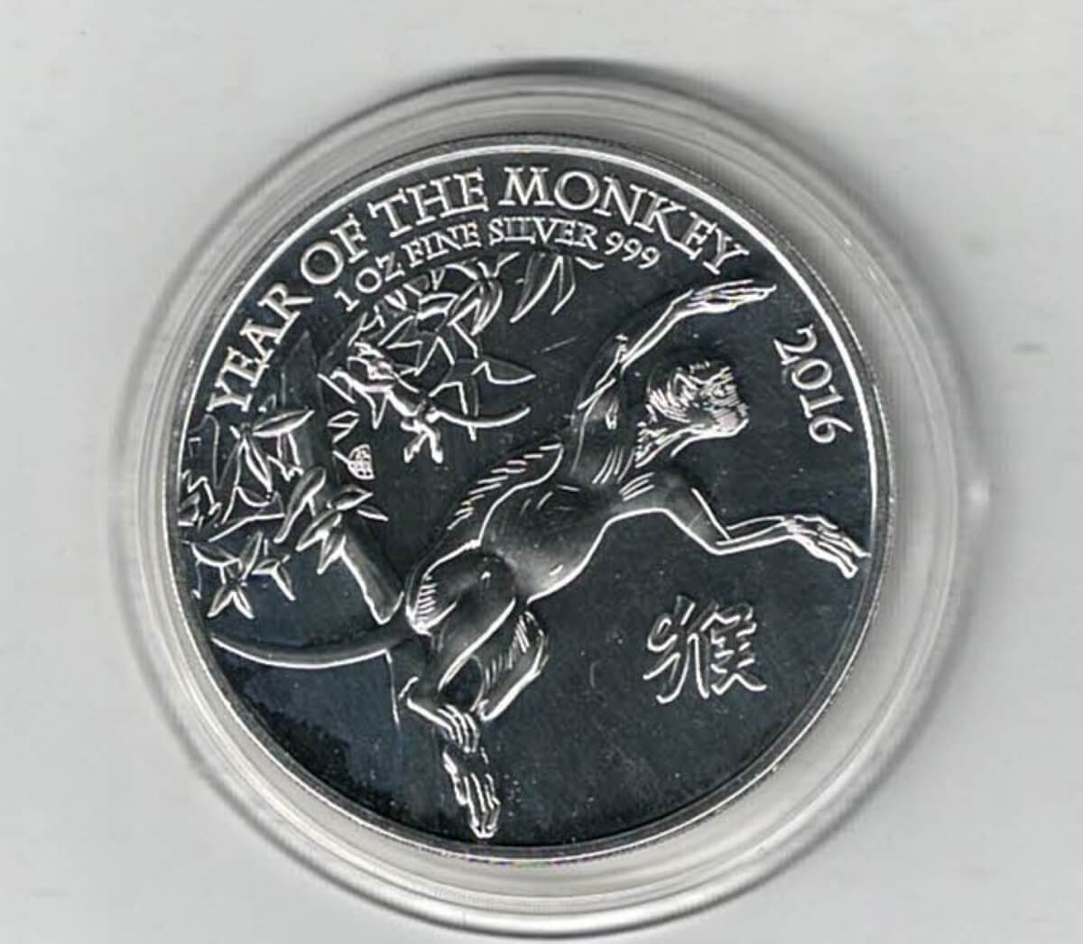 2016 Silver One Ounce Monkey Coin. The portrait of Queen Elizabeth II is on the obverse. The coin contains one ounce of 999 fine silver.2016 Silver One Ounce Year Of The Monkey Coin
