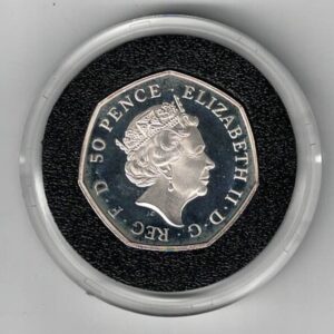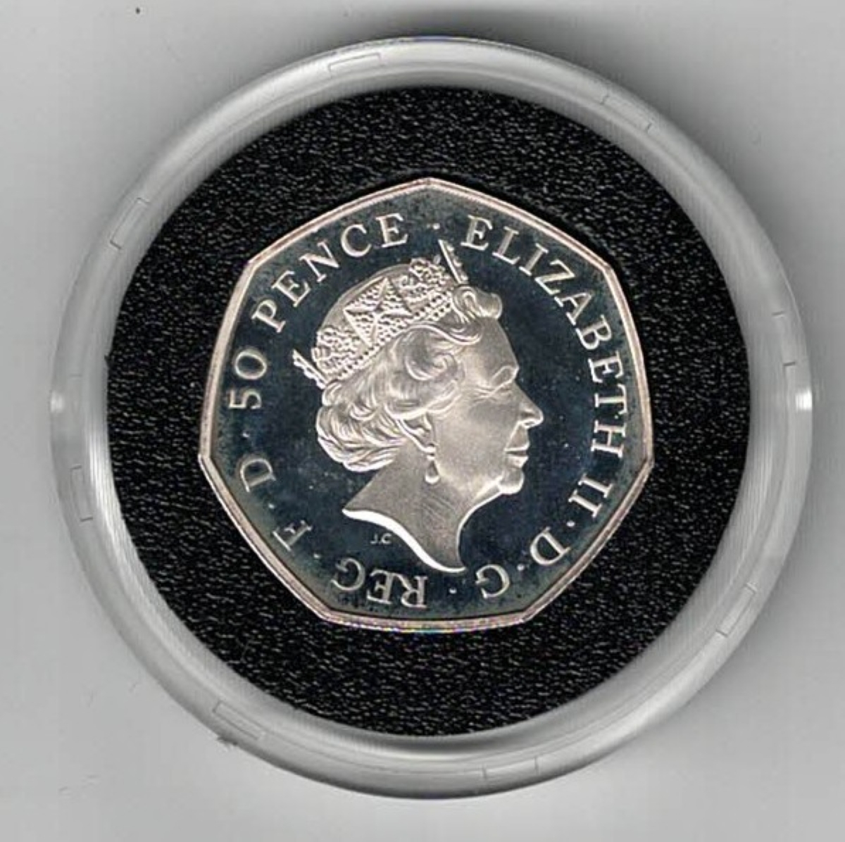 This fifty pence coin comes complete with a hard black box, card outer sleeve, capsule & certificate/booklet as issued by the royal mint.