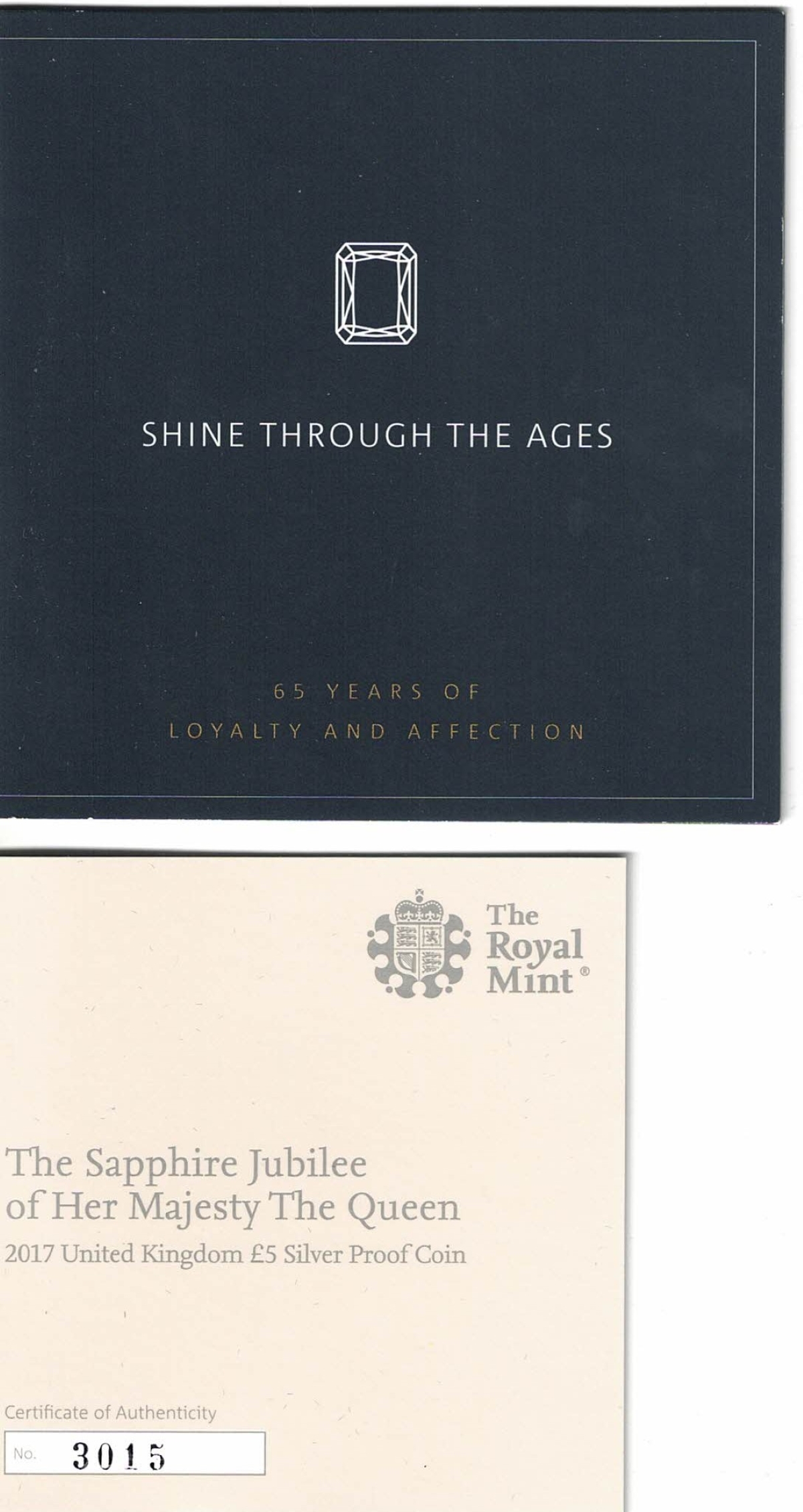2017 Five Pounds Silver Proof sapphire jubilee of her majesty the queen. All coins are in stock for despatch. You are buying one coin.2017 Five Pounds Silver Proof The Sapphire Jubilee