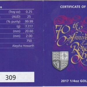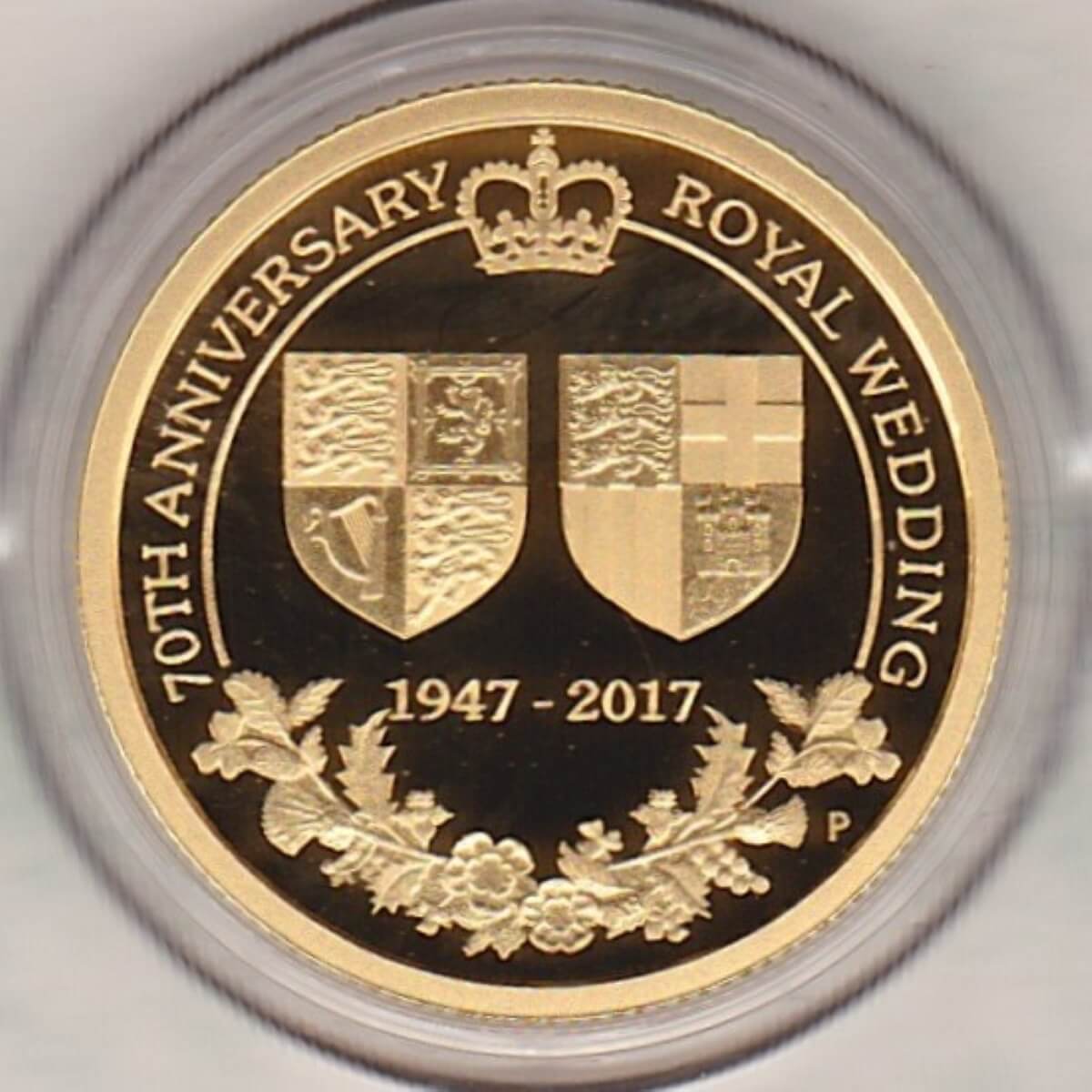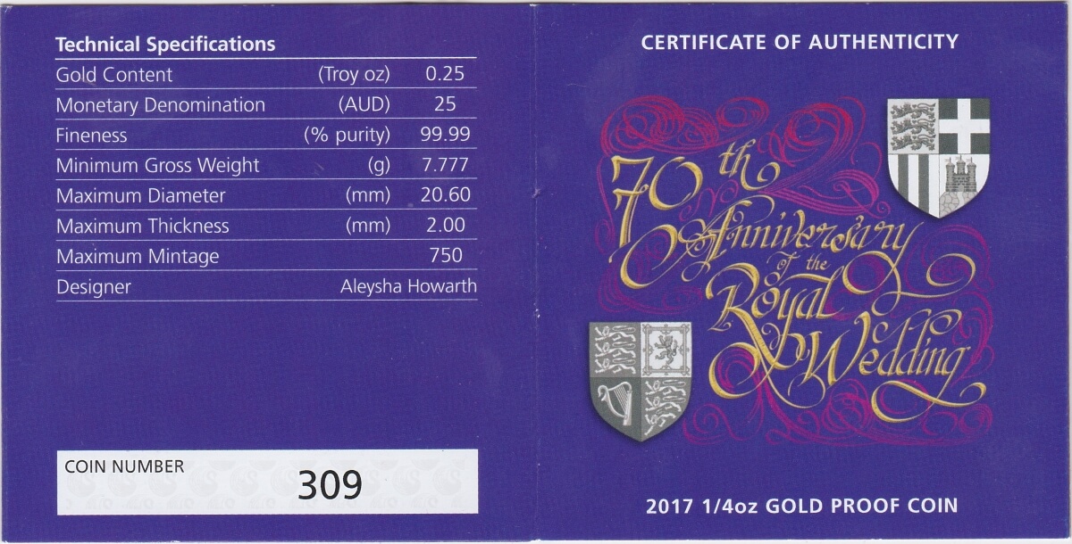 This 2017 quarter ounce coin was struck by the Perth Mint in Australia. The coin was issued to celebrate the 70th Anniversary of the Royal Wedding.