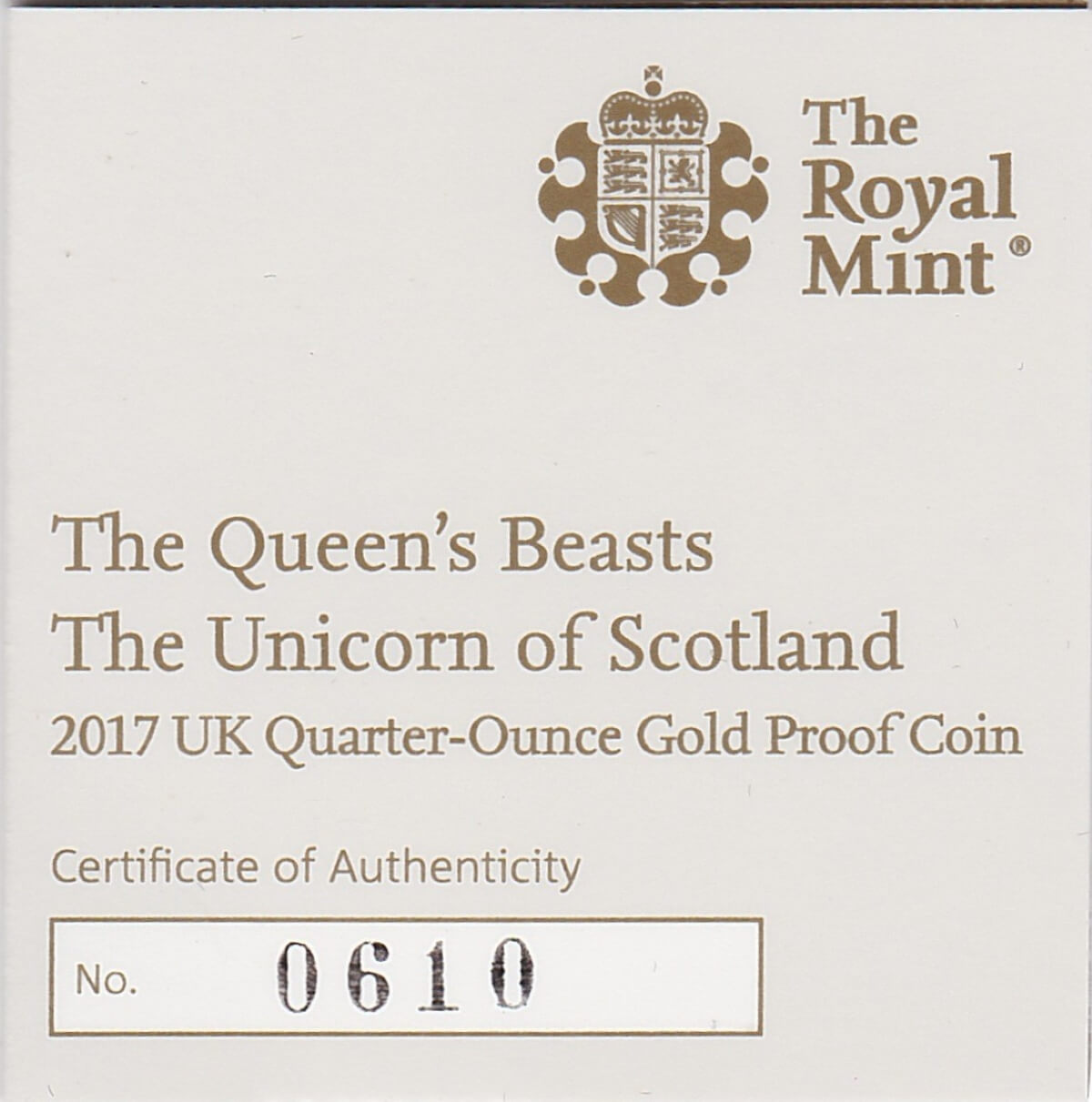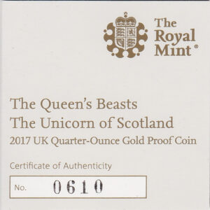 You are buying the 2017 Gold Proof Quarter Ounce Queen’s Beasts The Unicorn Of Scotland Coin in the pictures.