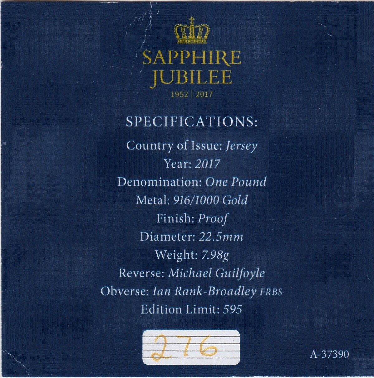 The Jersey coin was struck in 22 carat gold with an issue limit of only 595. The coin was issued to commemorate the Sapphire Jubilee of HM Queen Elizabeth II.