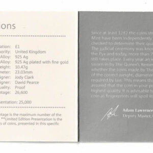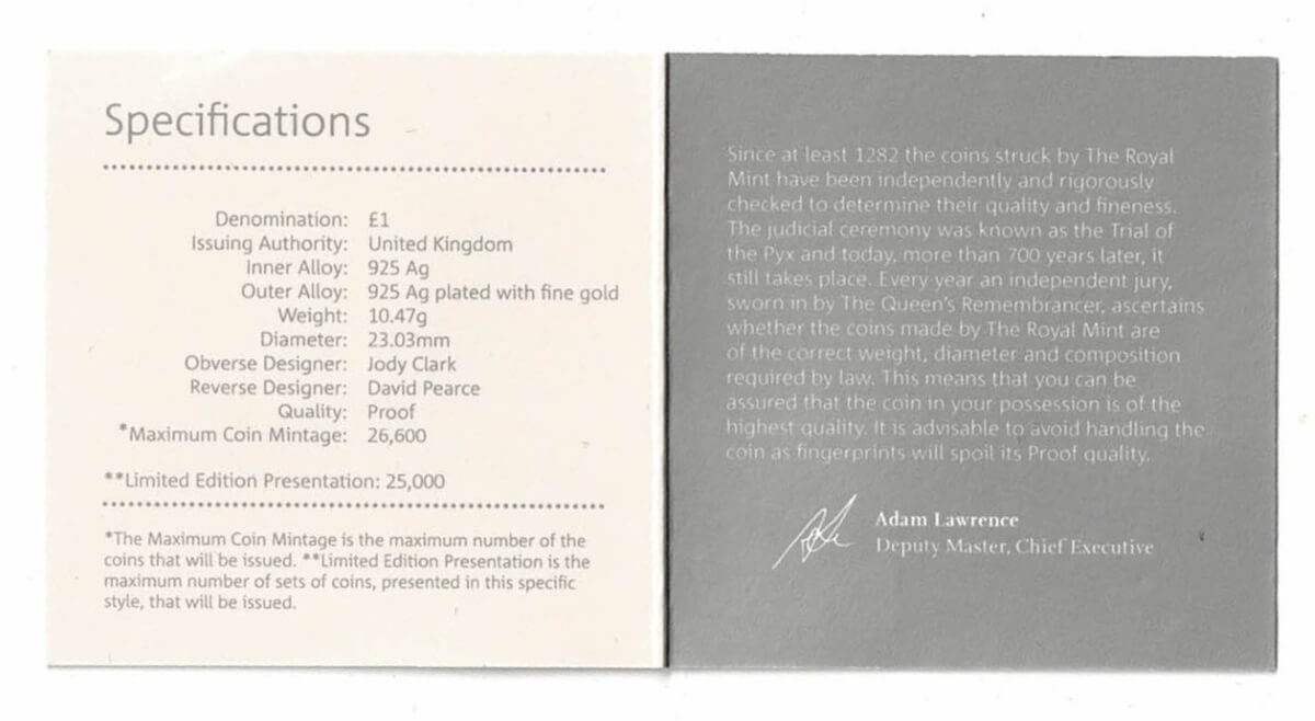 This coin comes in the original black box, outer card sleeve, capsule with certificate and booklet as issued by the Royal Mint.