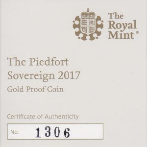 The 2017 piedfort proof sovereign is a coin struck in 22 carat gold by the Royal Mint.  The obverse features the fifth crowned portrait of Queen Elizabeth II facing right. The Queen is wearing the George IV State Diadem, with legend around.