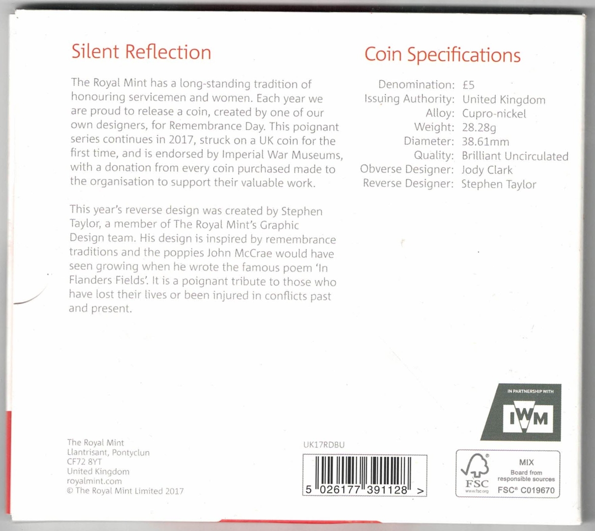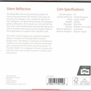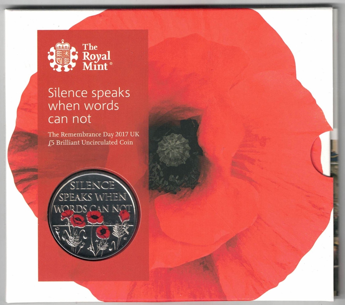 Sealed 2017 Royal Mint Brilliant Uncirculated The Remembrance Day, ‘Silence speaks when words can not’ Five Pound Coin In Mint Condition.