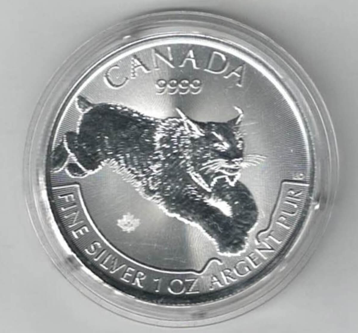 This coin struck in fine silver by the Canadian Mint . The obverse features Elizabeth II facing Right. The reverse features a lynx.