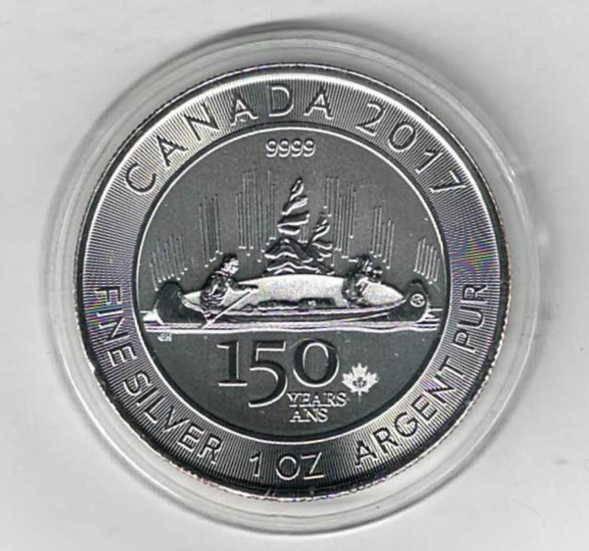 The 2017 coin struck in fine silver by the Canadian Mint . The obverse features Elizabeth II facing Right. The reverse features 150 years ans.