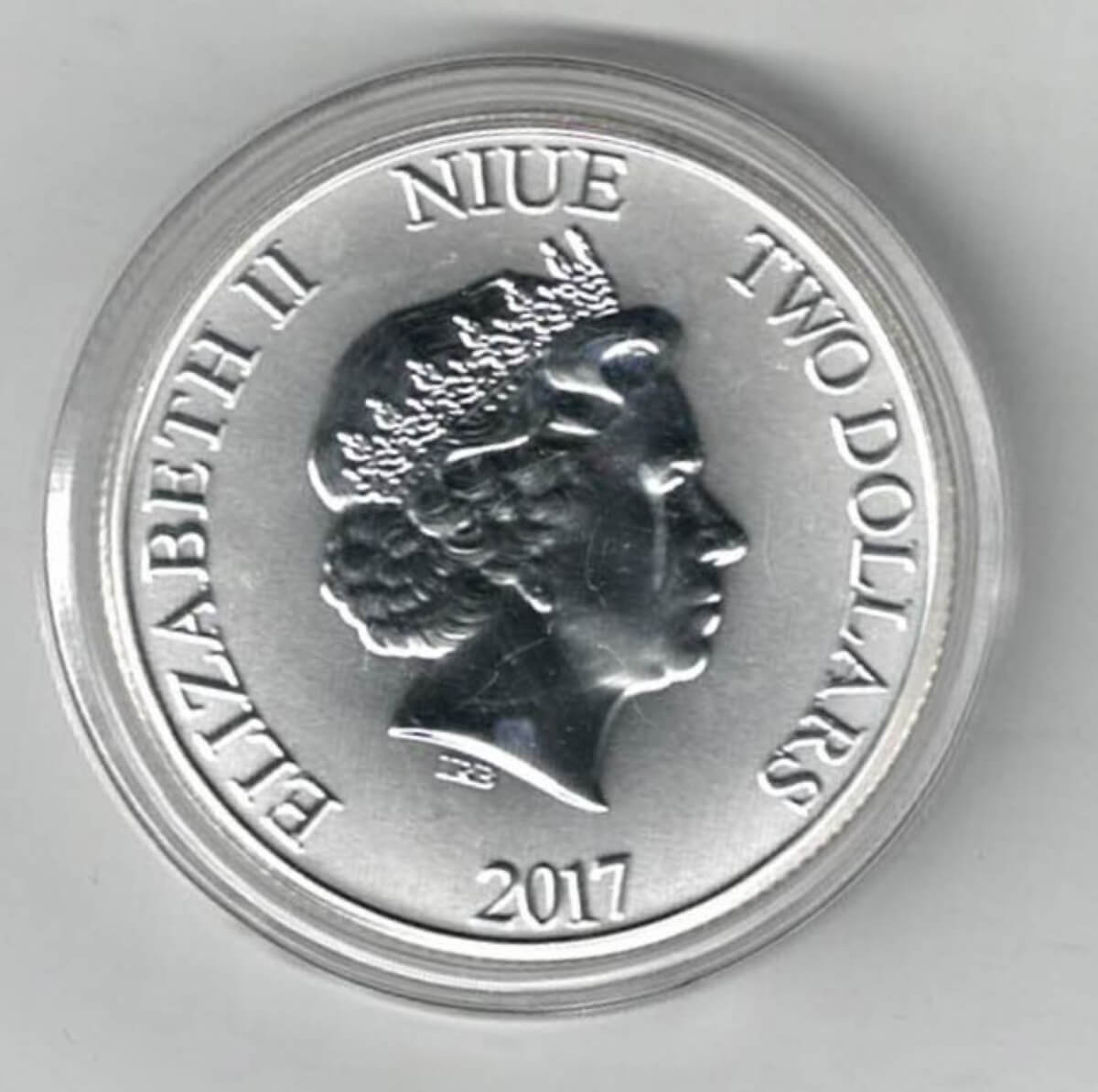 This 2017 coin was struck in .999 fine silver. The obverse features Elizabeth II facing Right. The reverse features Darth Vader.