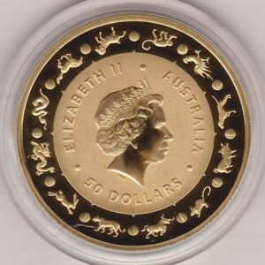 2018 Australia Gold Half Ounce coin. The obverse features Elizabeth II. The reverse features two dogs. This coin was issued as part of the Lunar series II.2018 Australia Gold Half Ounce – Dog