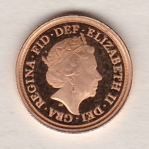 The 2018 proof quarter sovereign is a coin struck in 22 carat gold by the Royal Mint. The obverse features the fifth crowned portrait of HM Queen Elizabeth II facing right, with legend around. The reverse side of this coin you can see Benedetto Pistrucci’s depiction of Saint George slaying a dragon. The coin’s date is also inscribed at the bottom of the reverse.
