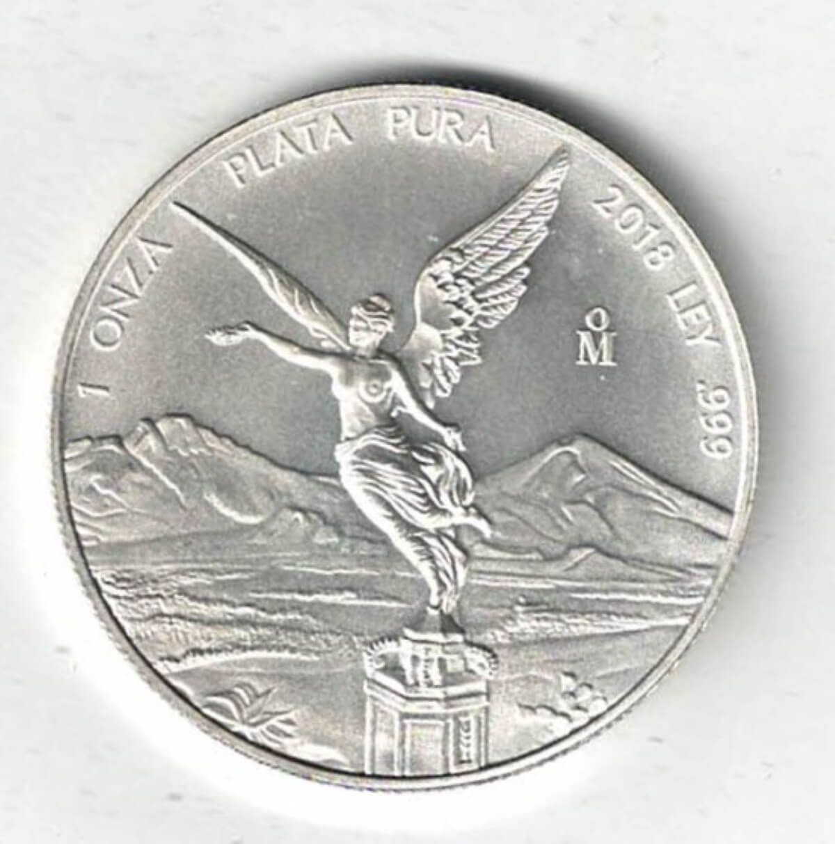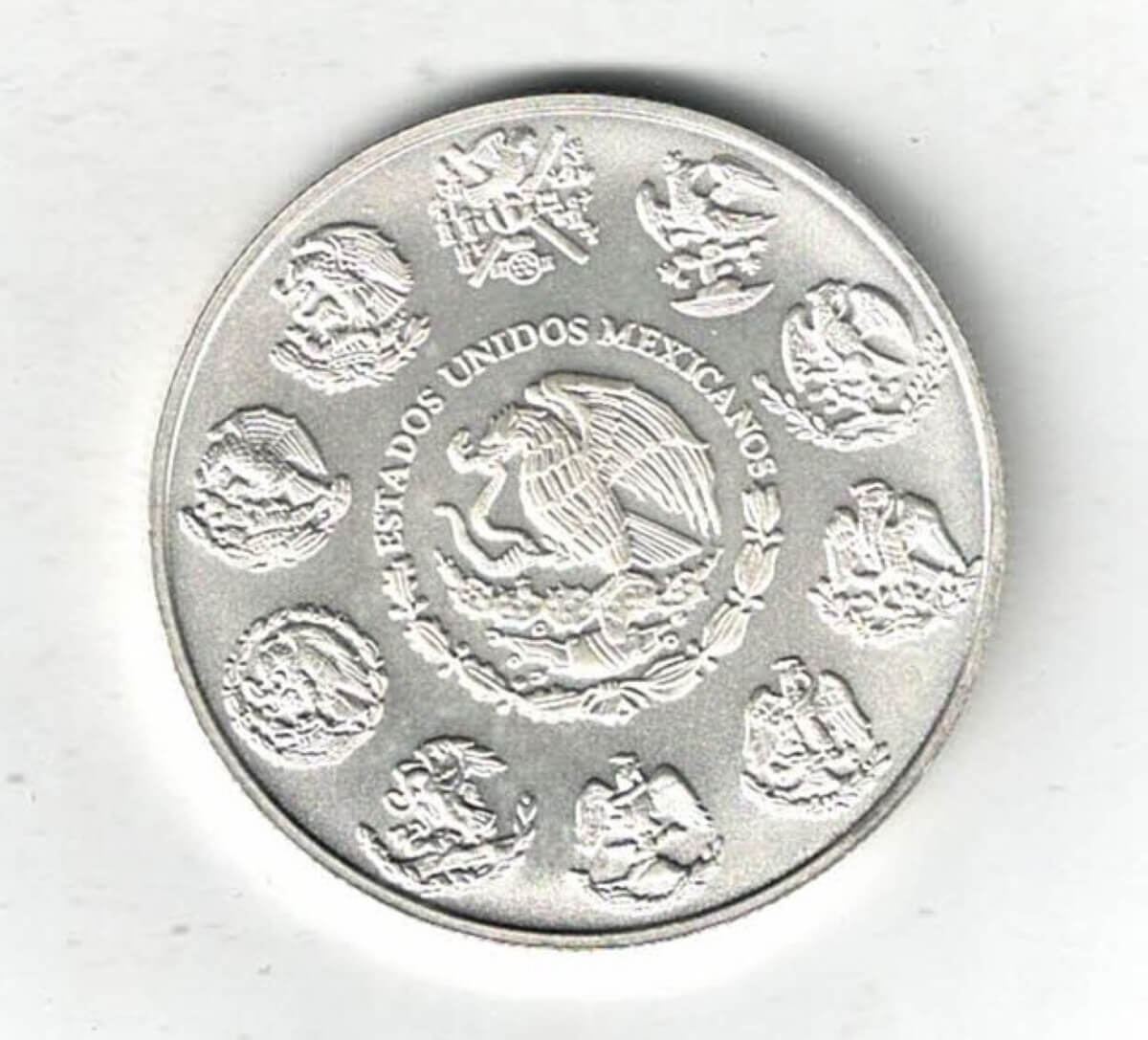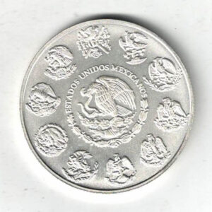 This Silver One Ounce coin has the Mexican coat of arms on the obverse. The reverse features features winged victory on a crowned pedestal with the mountains of Mexico city in the background.