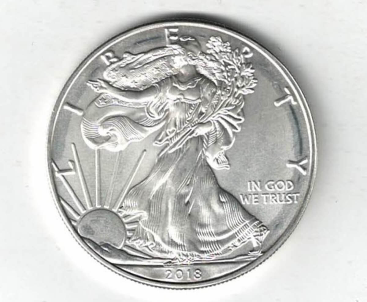 The 2018 Eagle is a coin struck in fine silver by the US Mint . The obverse features Walking Liberty . The reverse features the Heraldic eagle with shield.