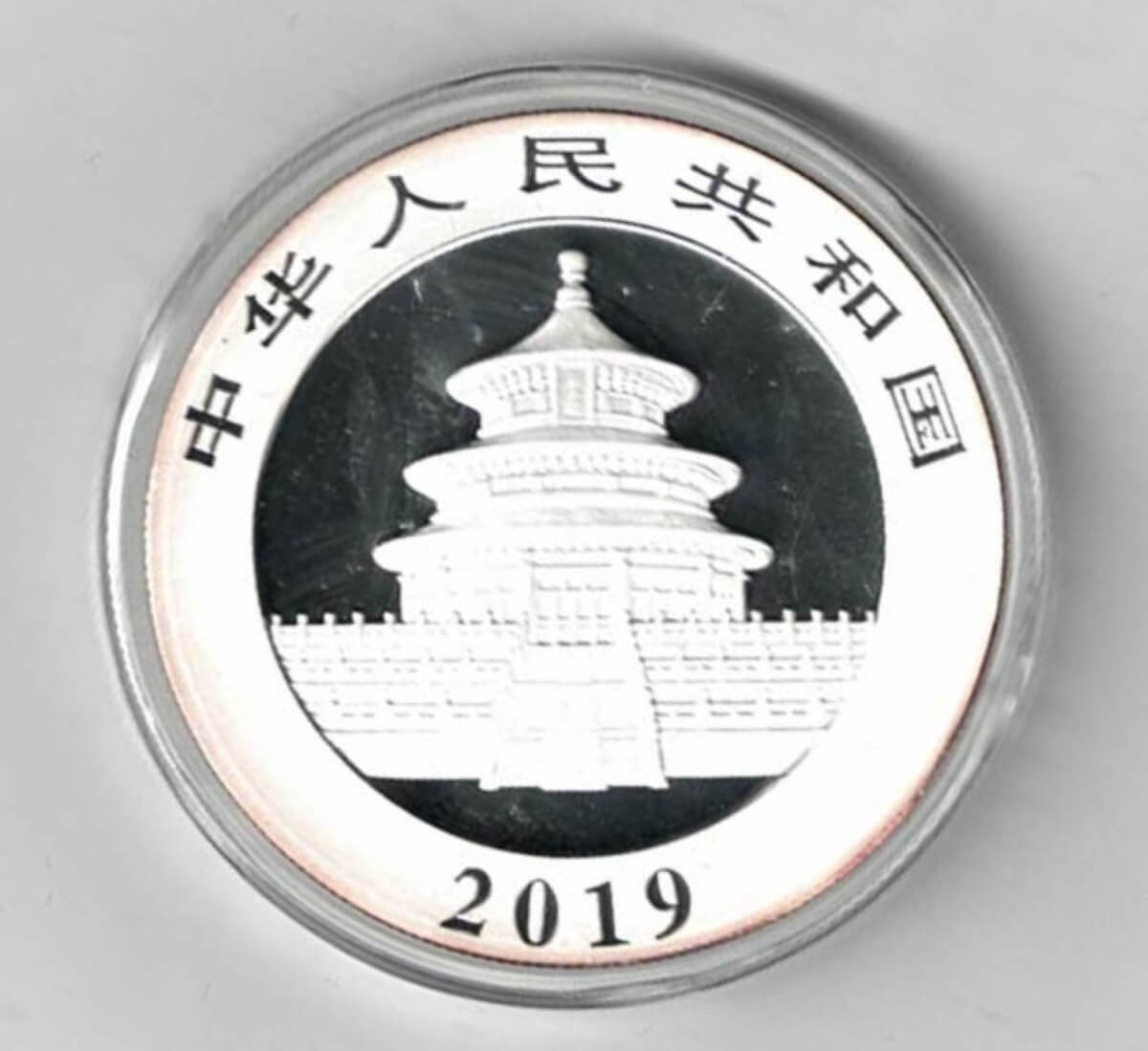 The 2019 Ten Yuan is a coin struck in fine silver by the Chinese Mint . The obverse features the Temple of heaven. The reverse features a two pandas.