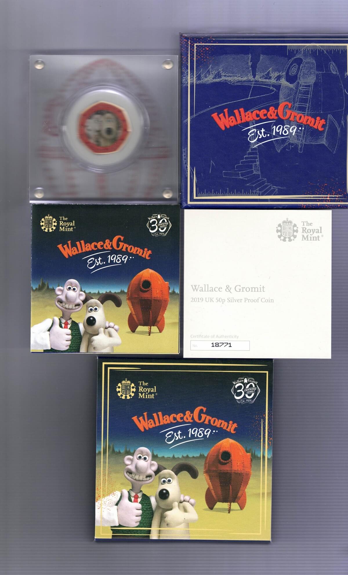 2019 Silver Proof Fifty Pence Coin Wallace & Gromit. This coin comes in the original box with certificate as issued by the royal mint.2019 Silver Proof Fifty Pence Coin Wallace & Gromit